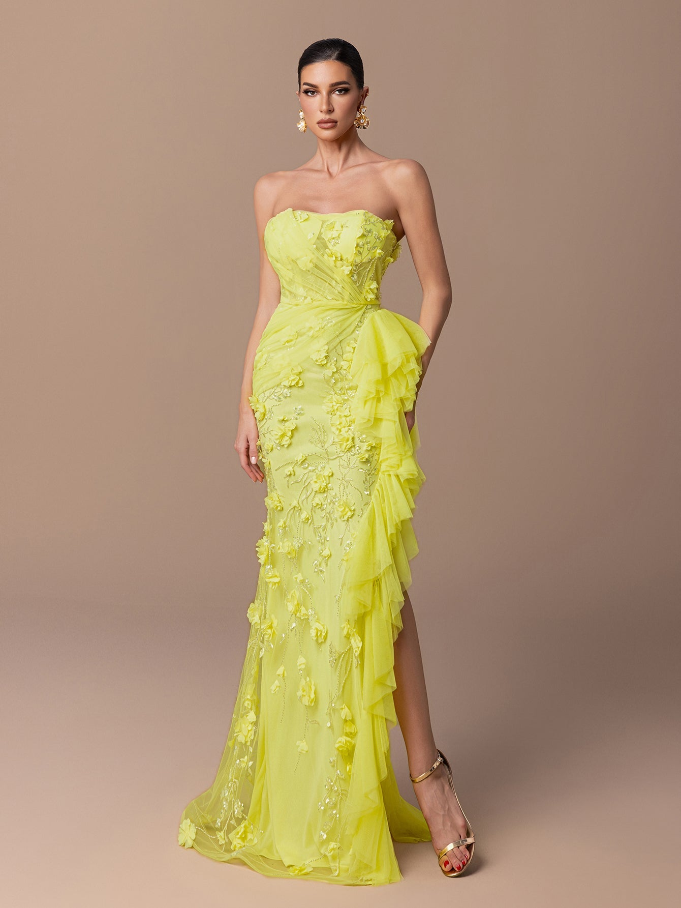 Strapless Gown with Floral Bead Embroidery, Layered Ruffle Hem & Crisscross Back Straps