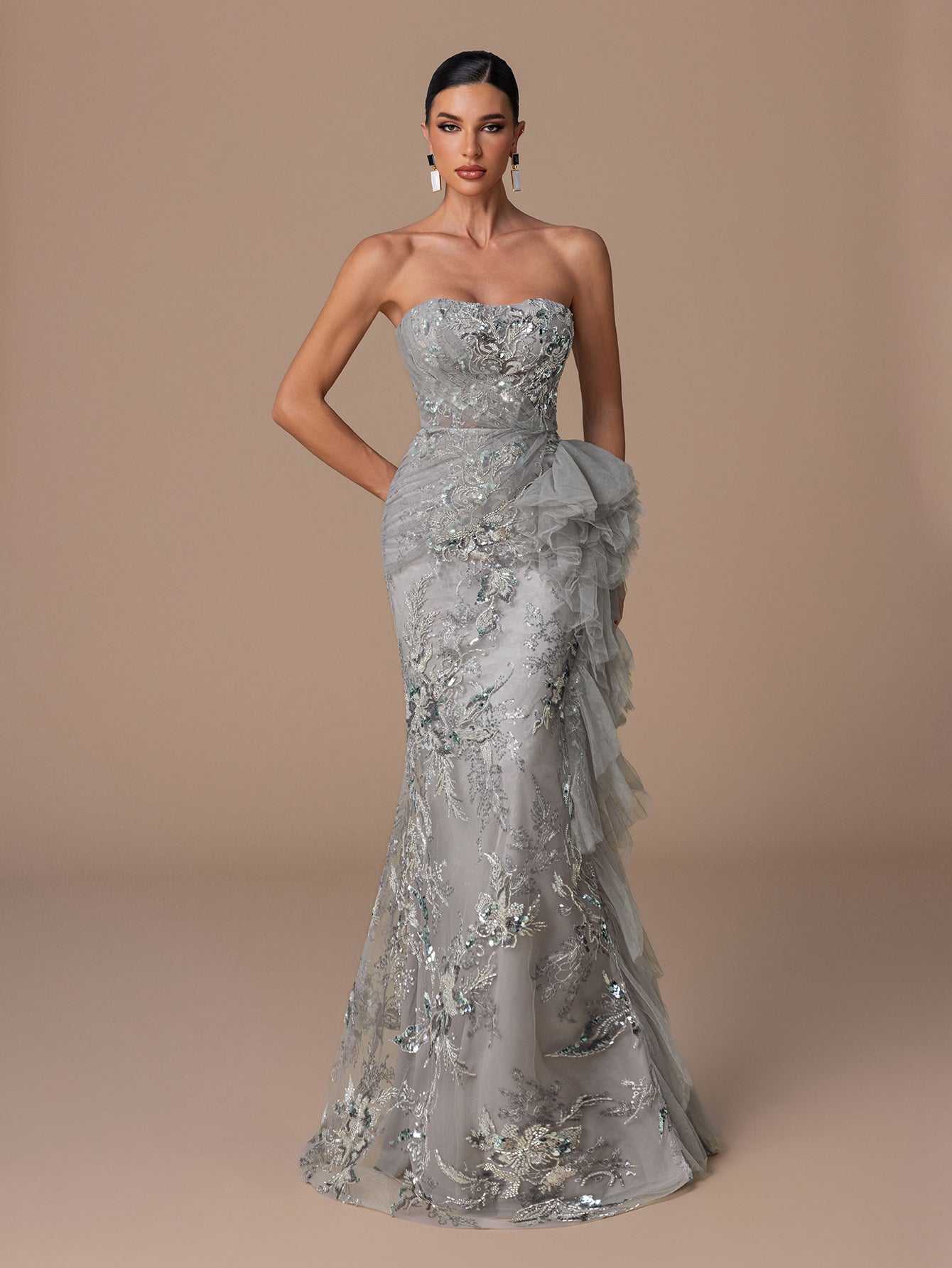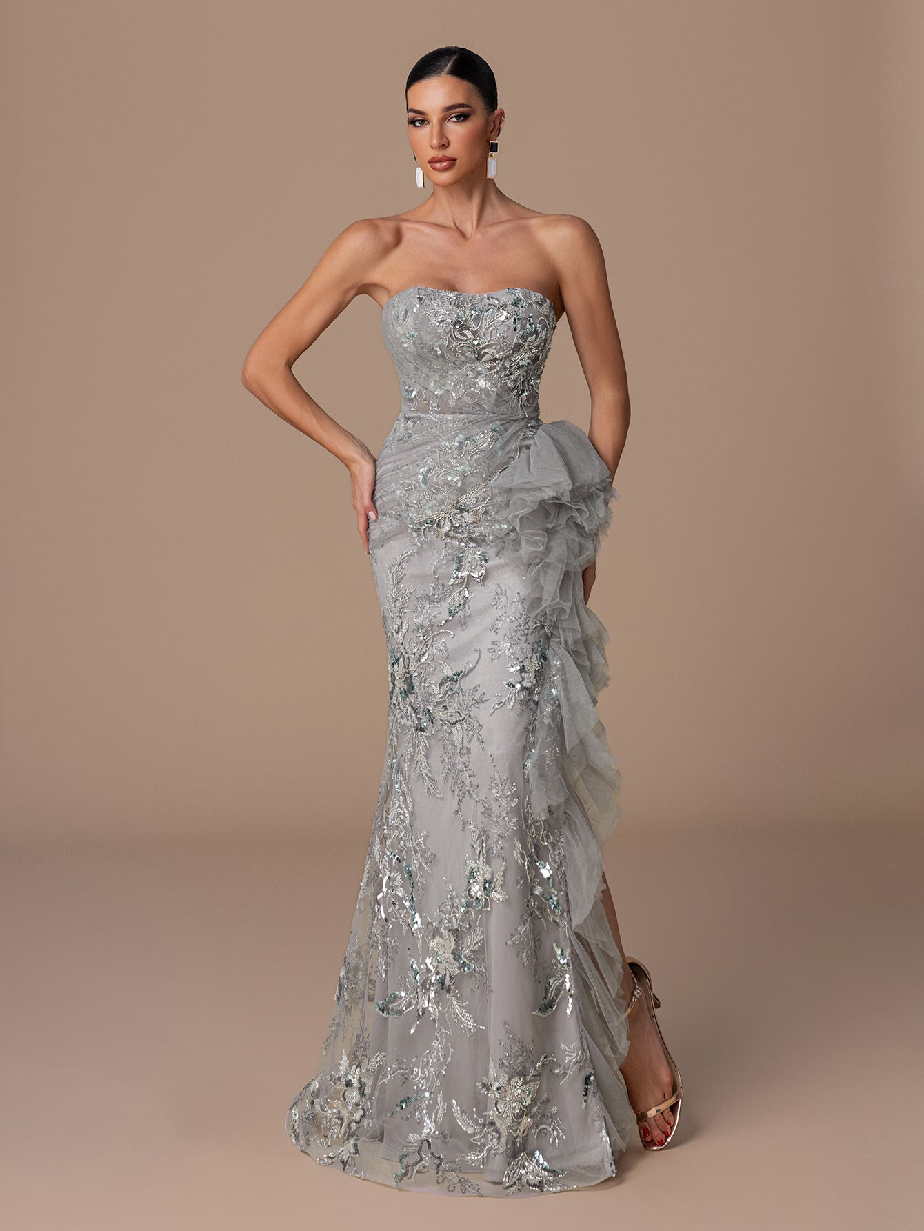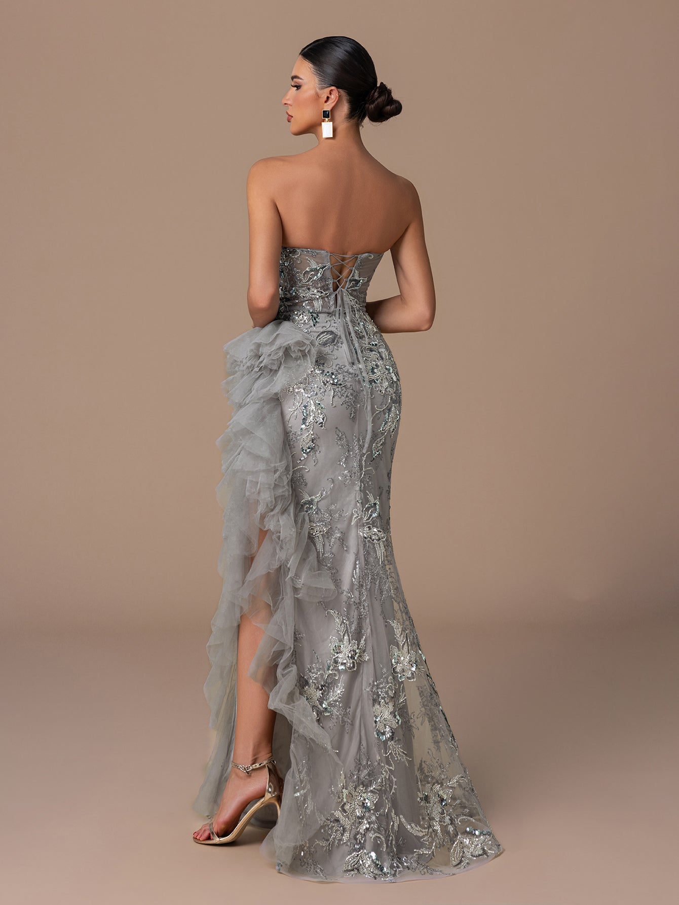 Strapless Sequin Gown with Floral Beads Embroidery, Crisscross Back Straps & Layered Ruffled Hem