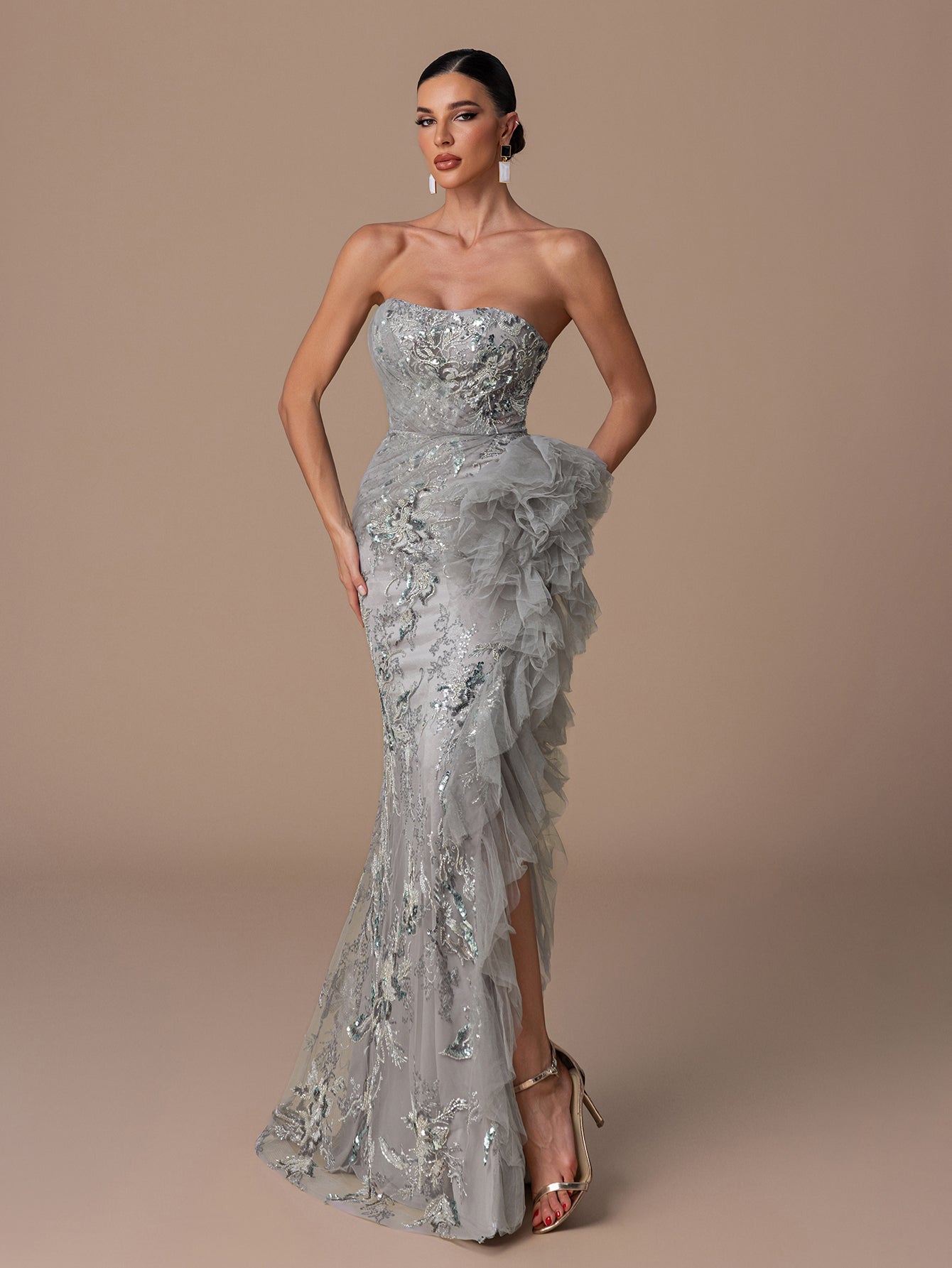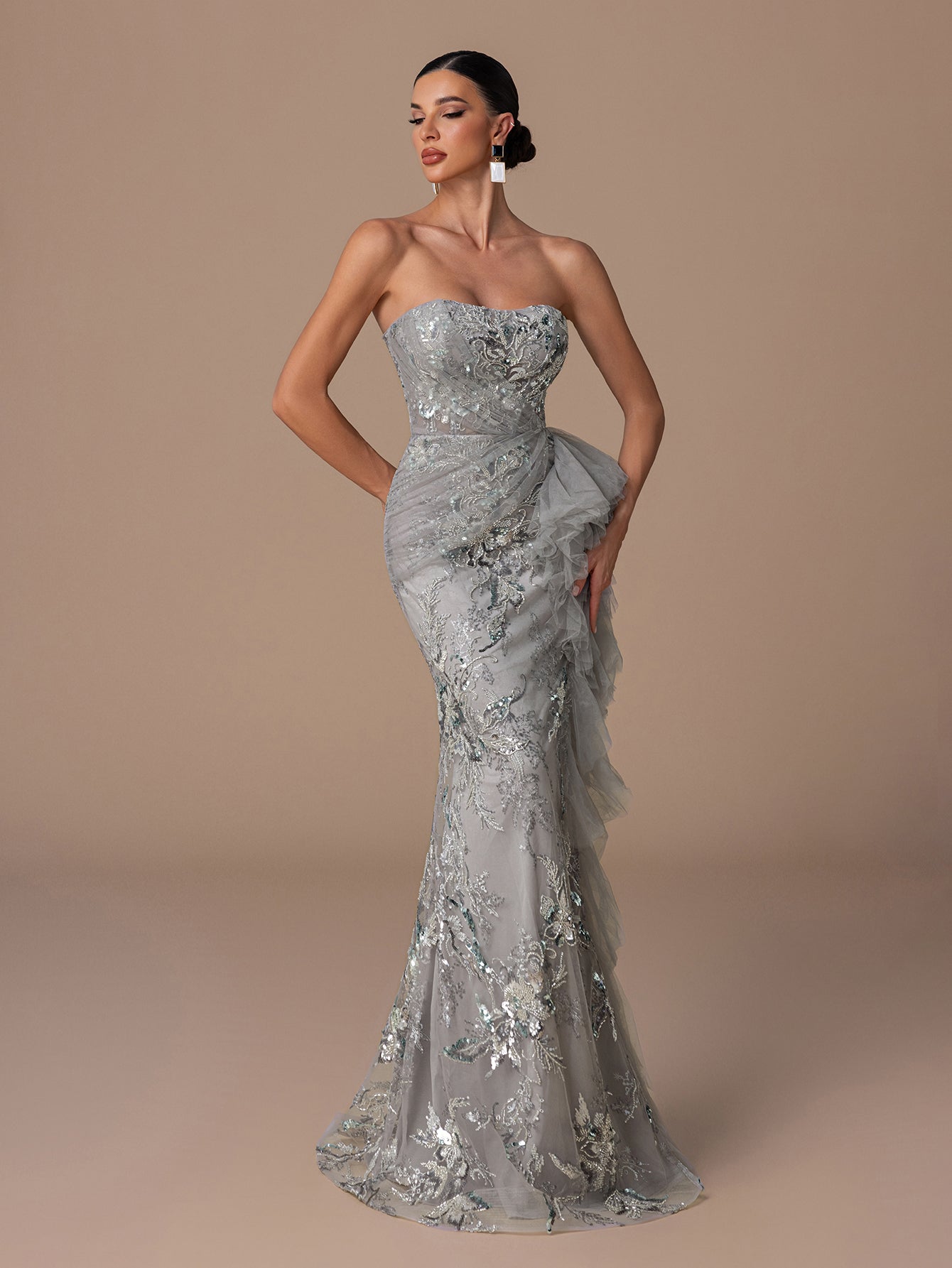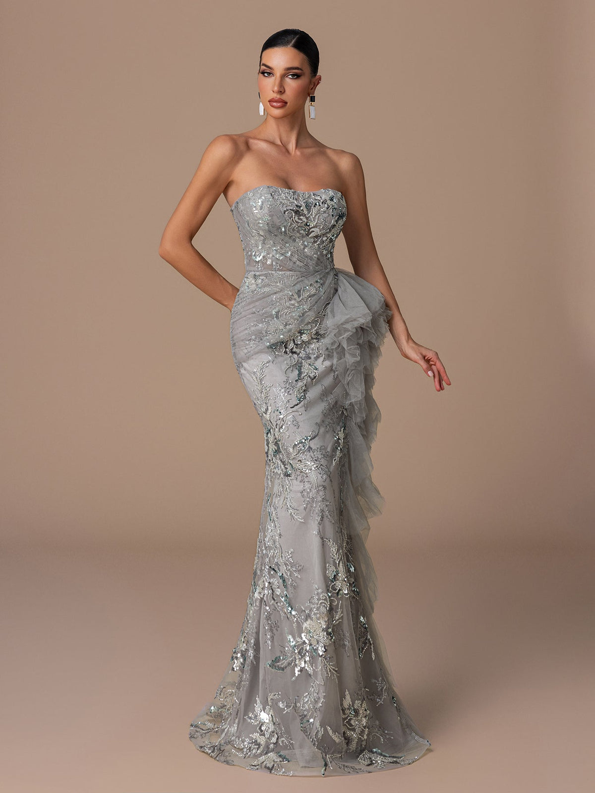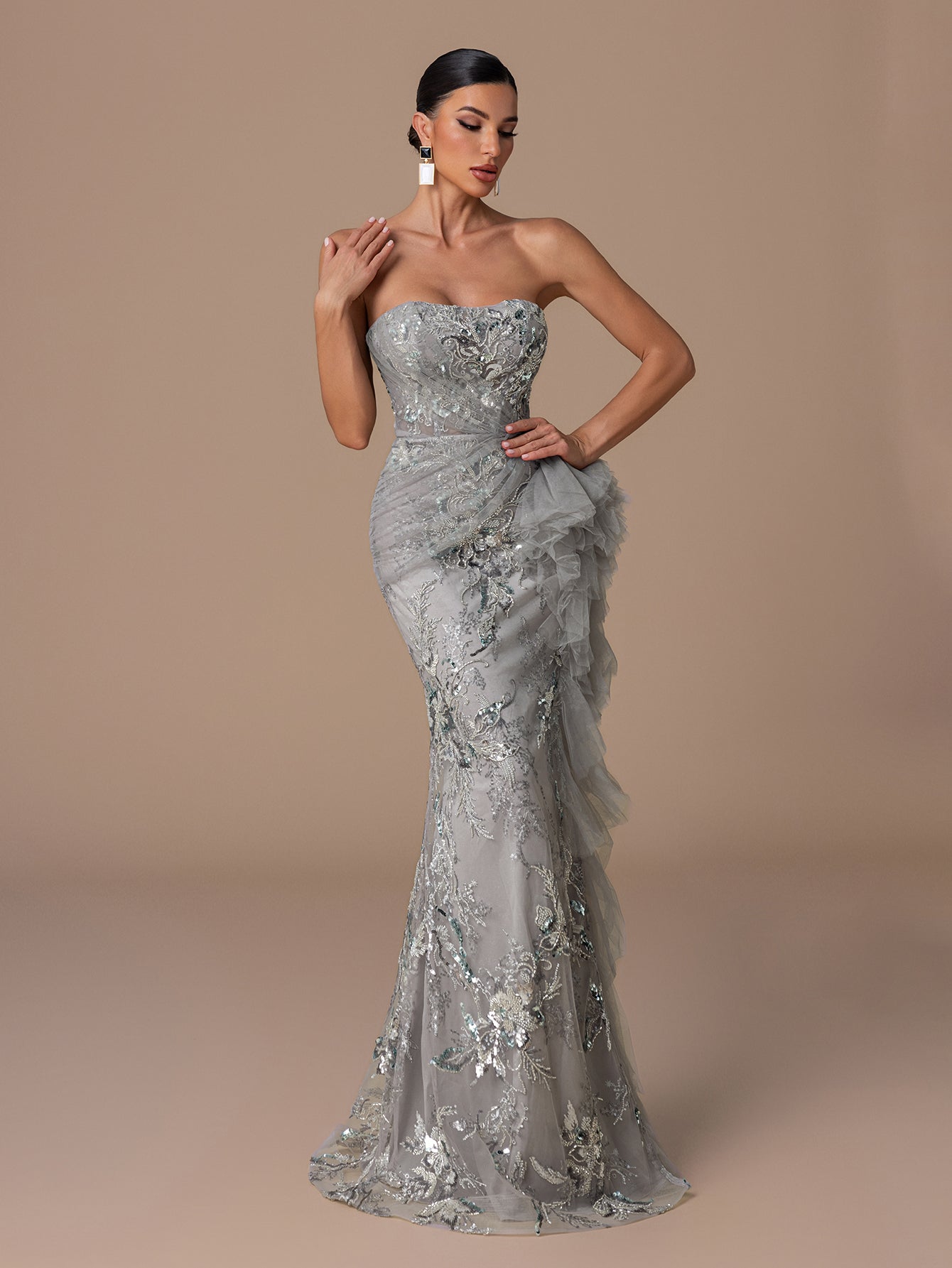 Strapless Sequin Gown with Floral Beads Embroidery, Crisscross Back Straps & Layered Ruffled Hem