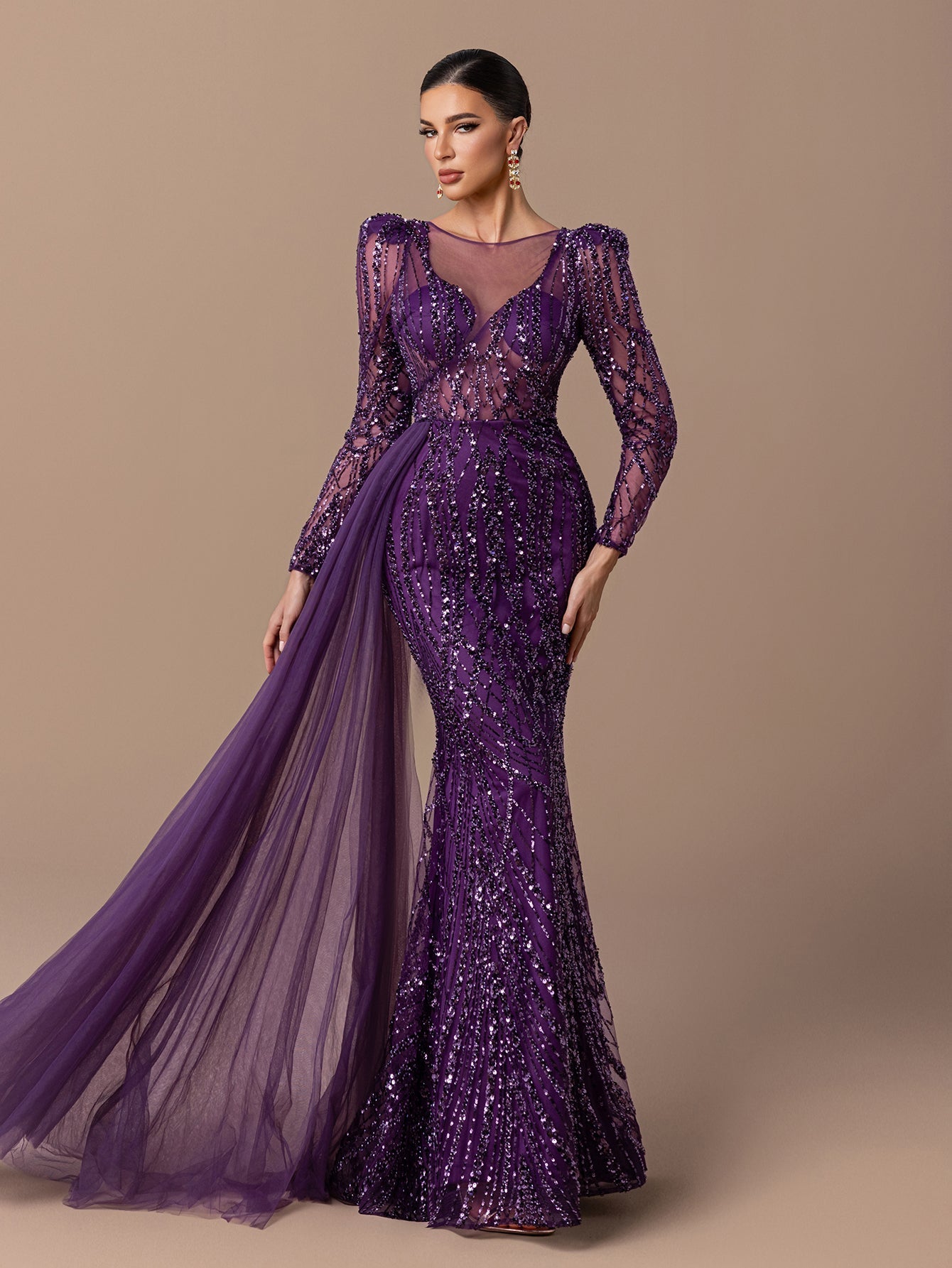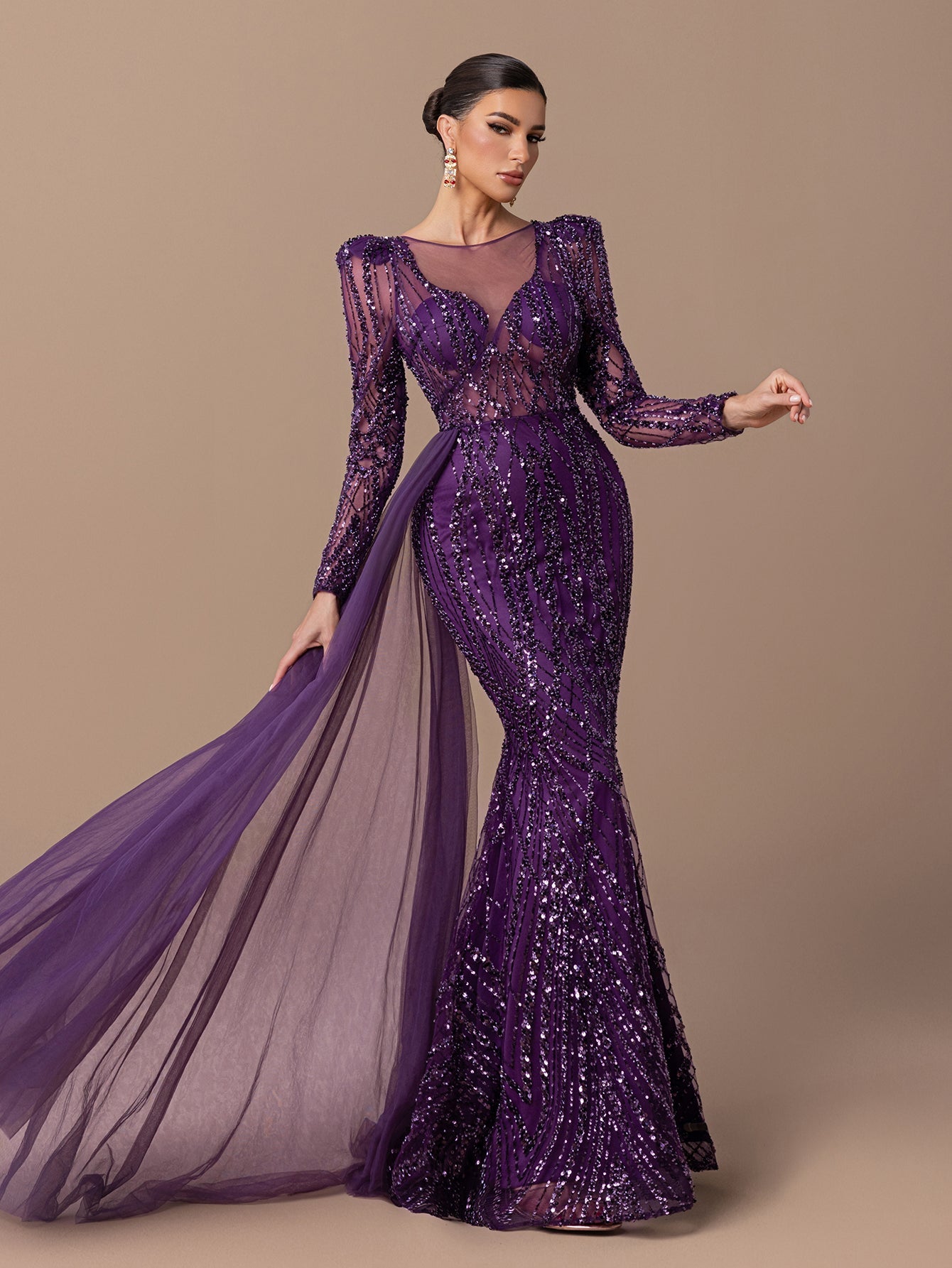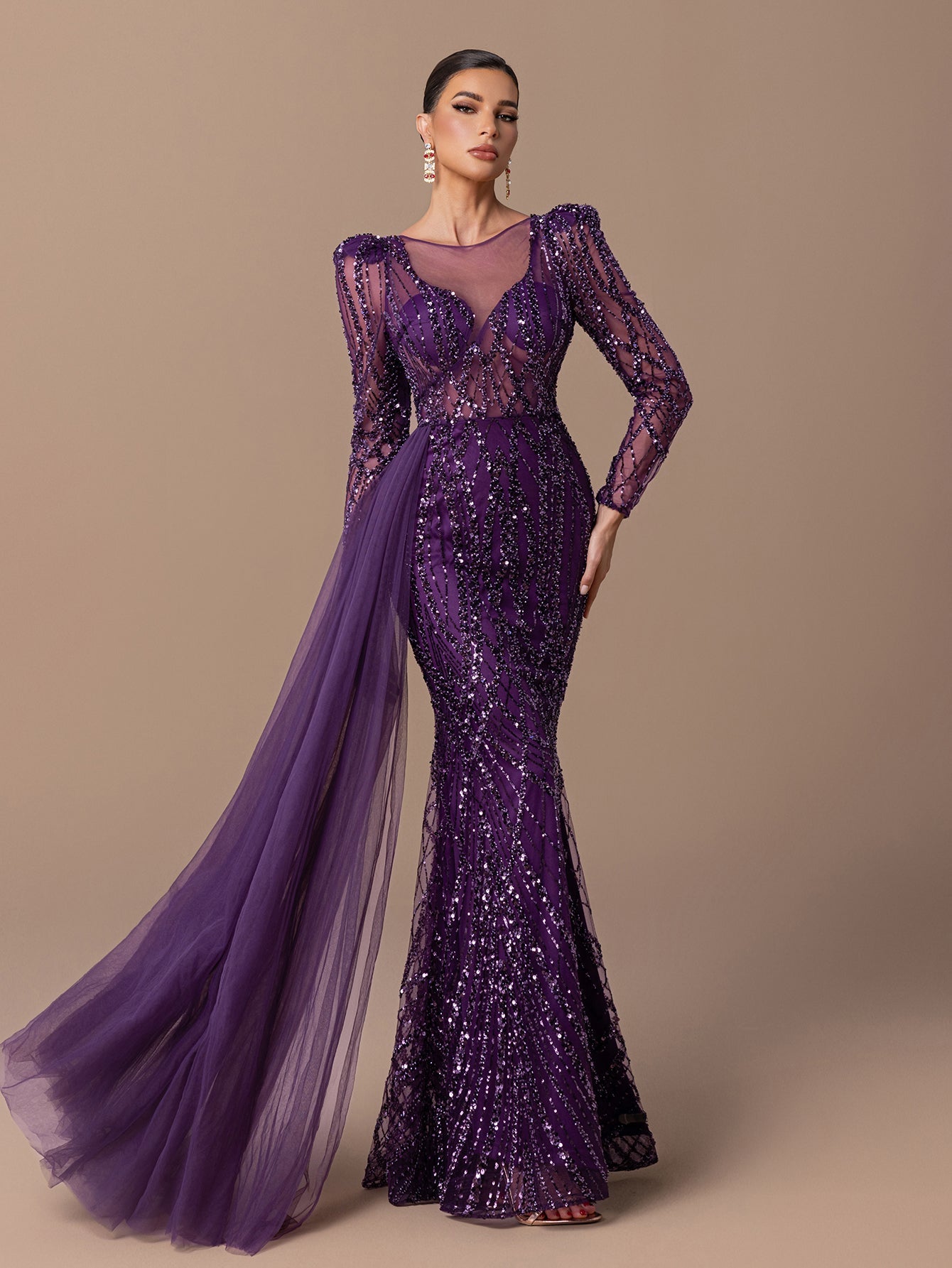 Mermaid Gown with Sheer Tulle, Beaded Sequin Embroidered, Long Sleeves and Tulle Shawl