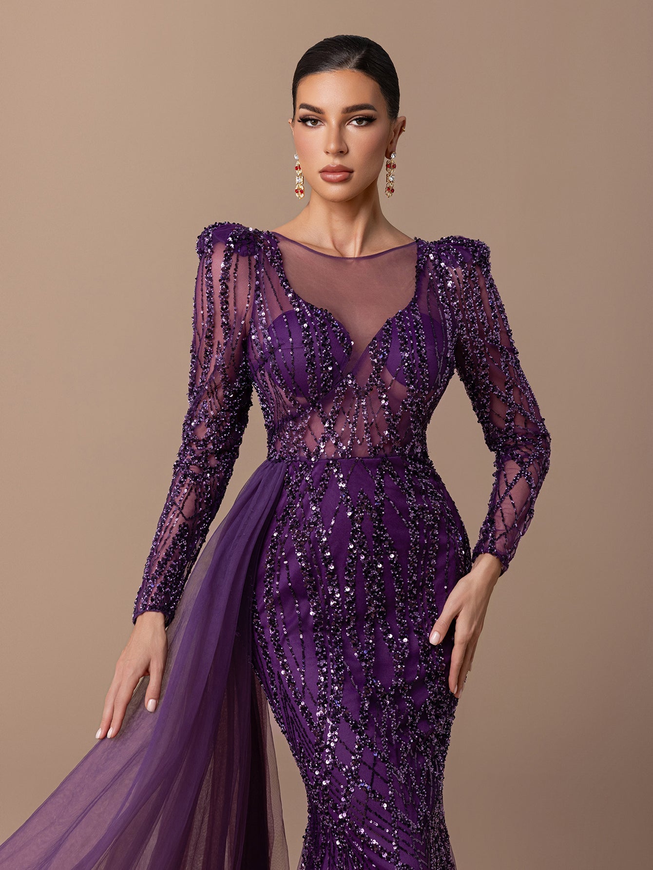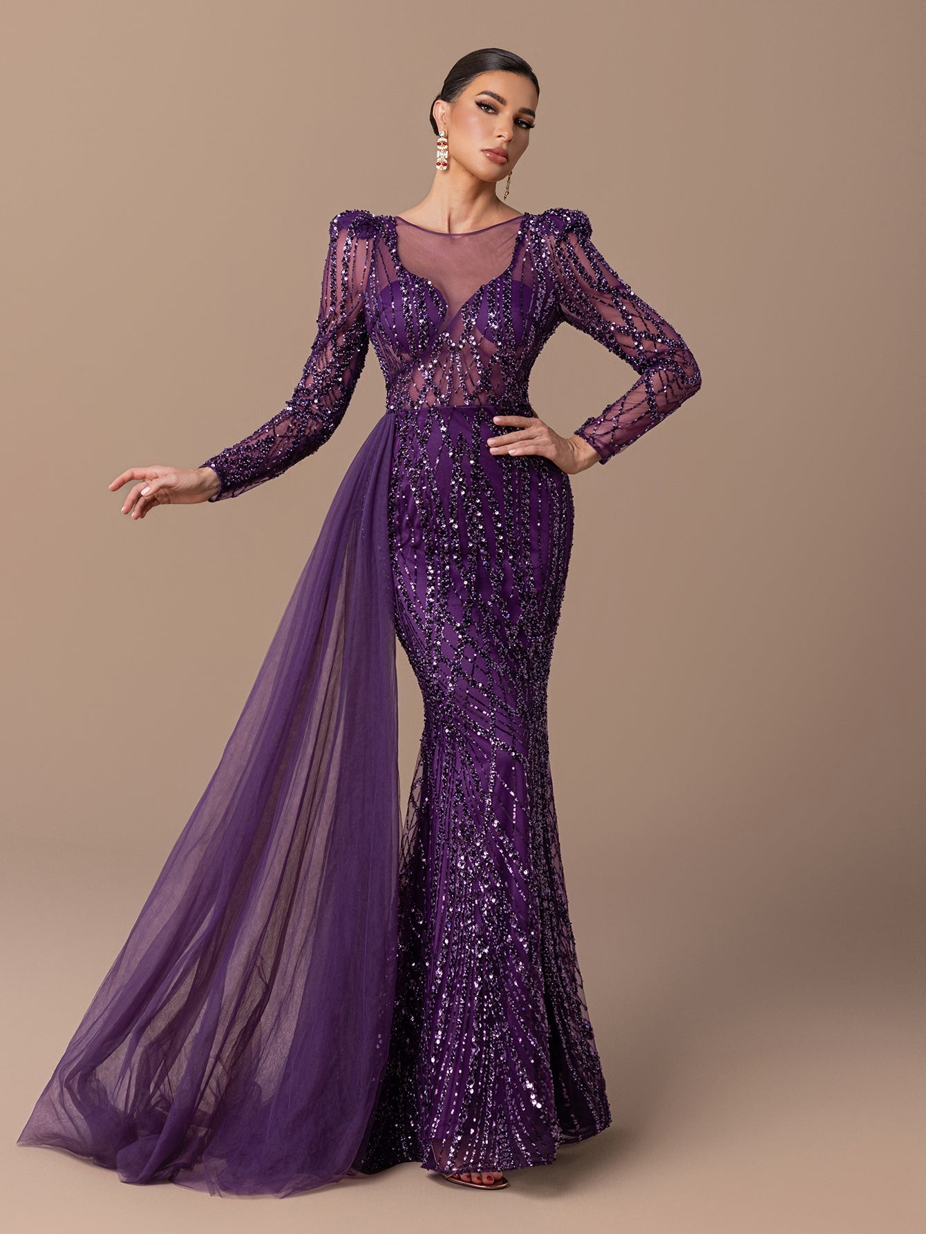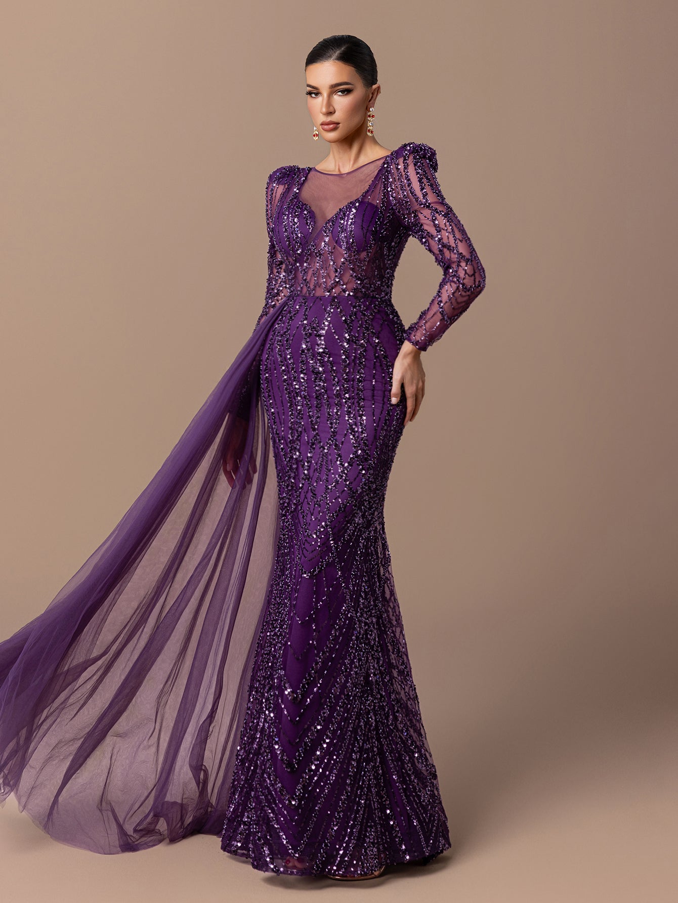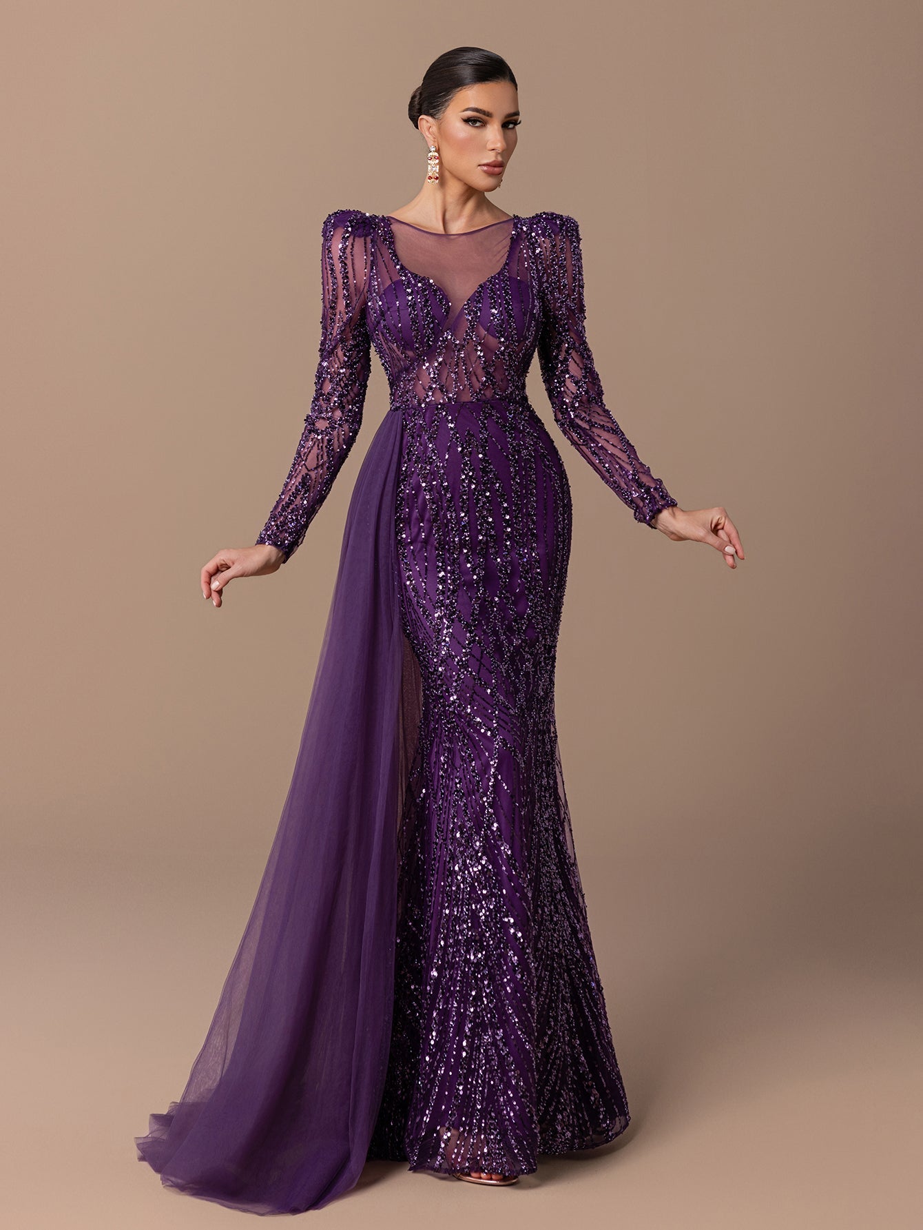 Mermaid Gown with Sheer Tulle, Beaded Sequin Embroidered, Long Sleeves and Tulle Shawl