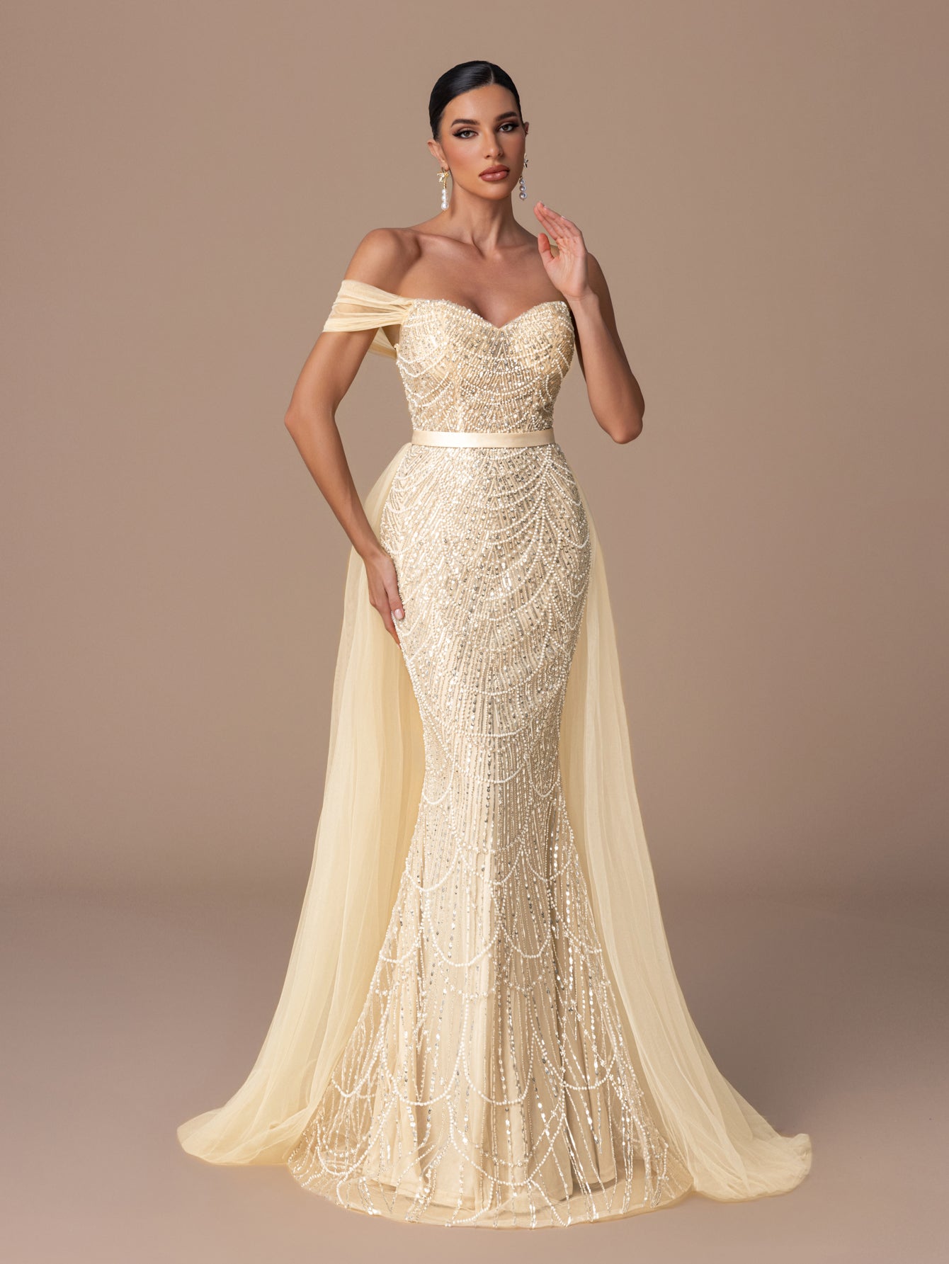 One-Shoulder Mermaid Gown with Beaded Sequins, Tie-Back & Tulle Overlay