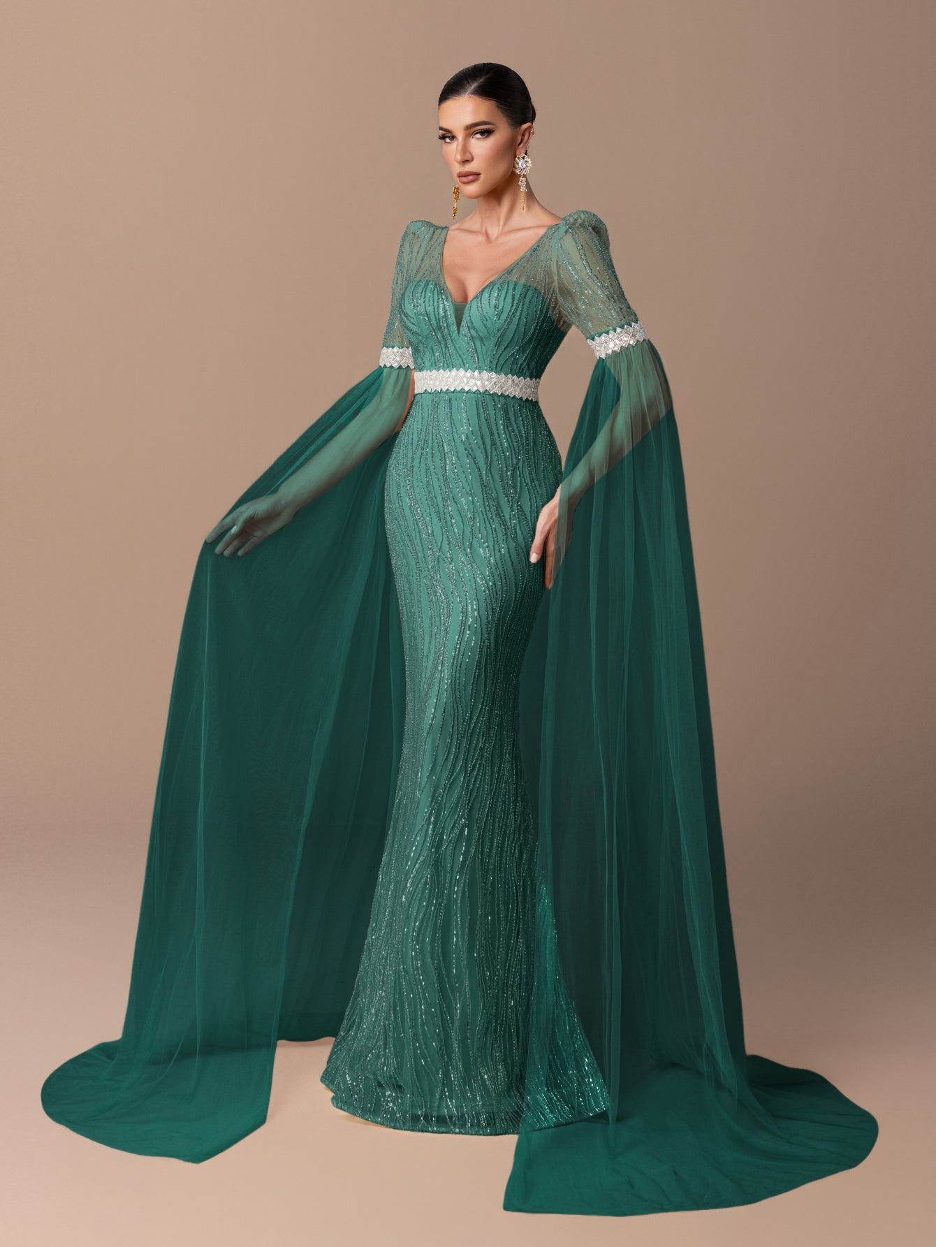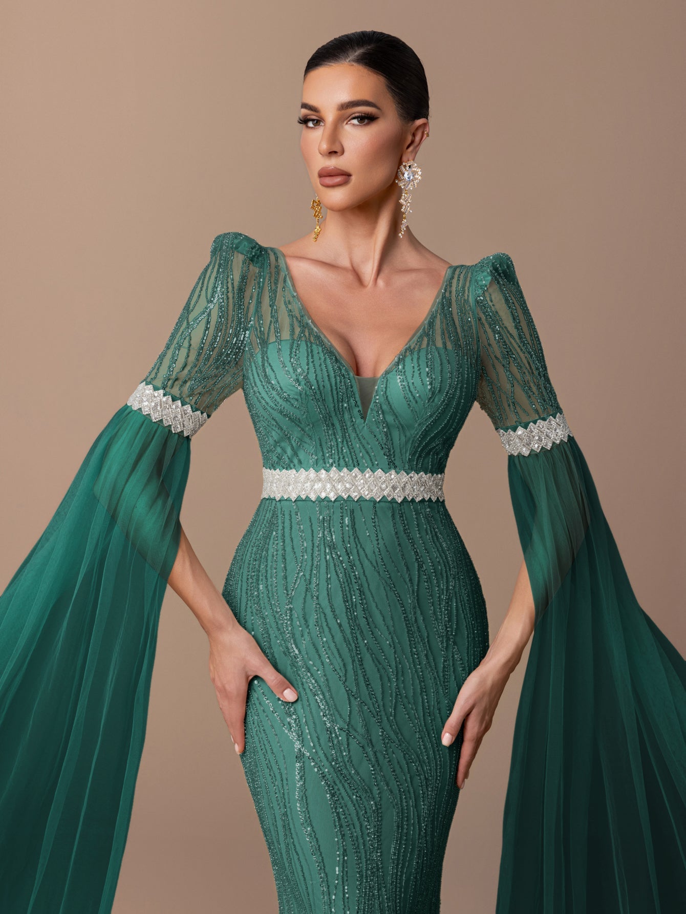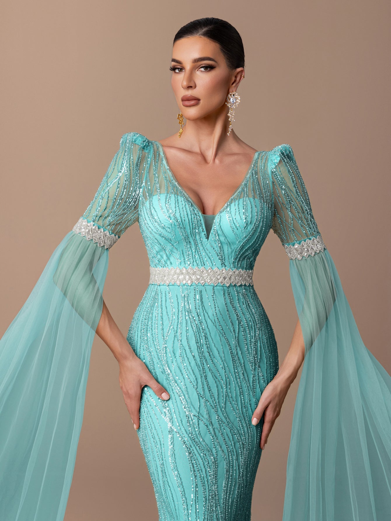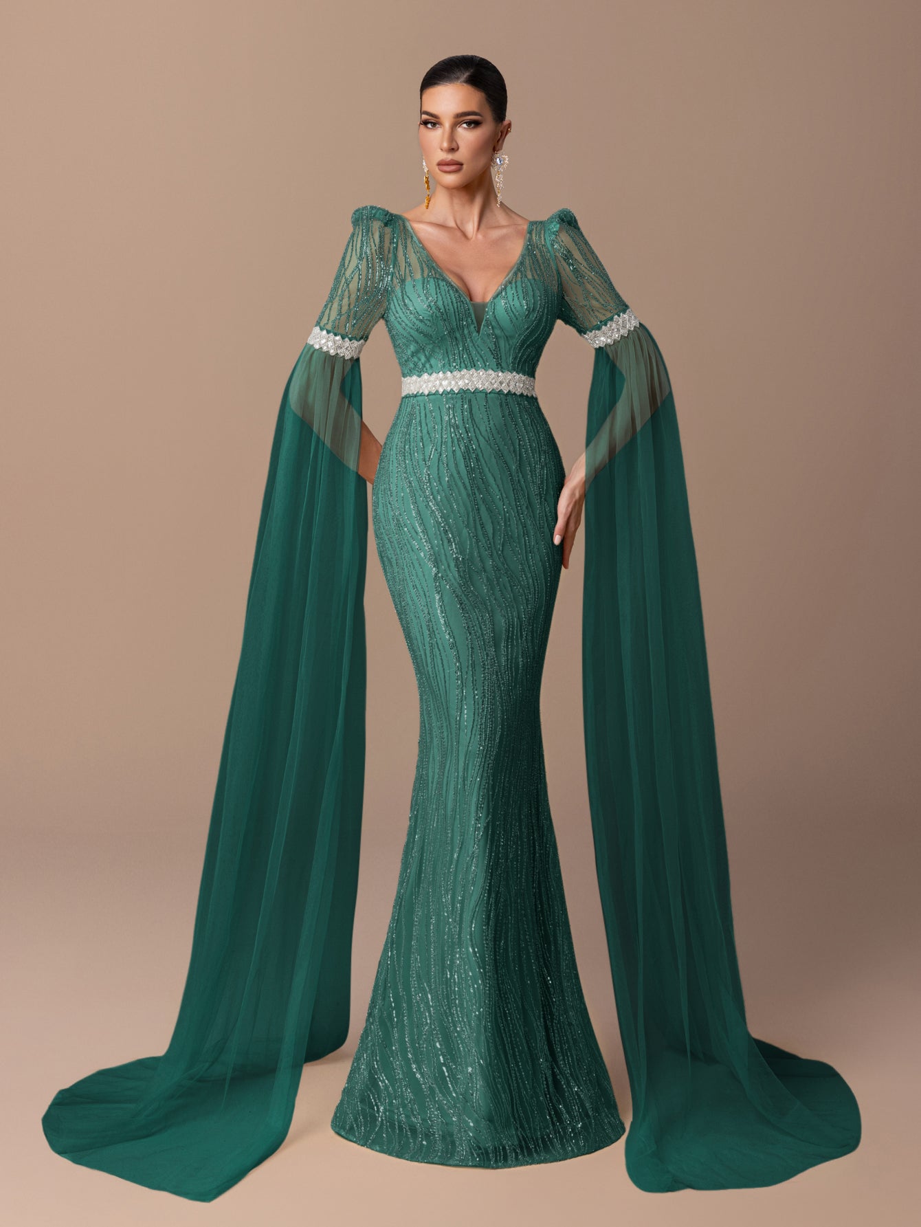 Beaded Sequin Mermaid Gown with Deep V-Neck, Sheer Tulle Sleeves