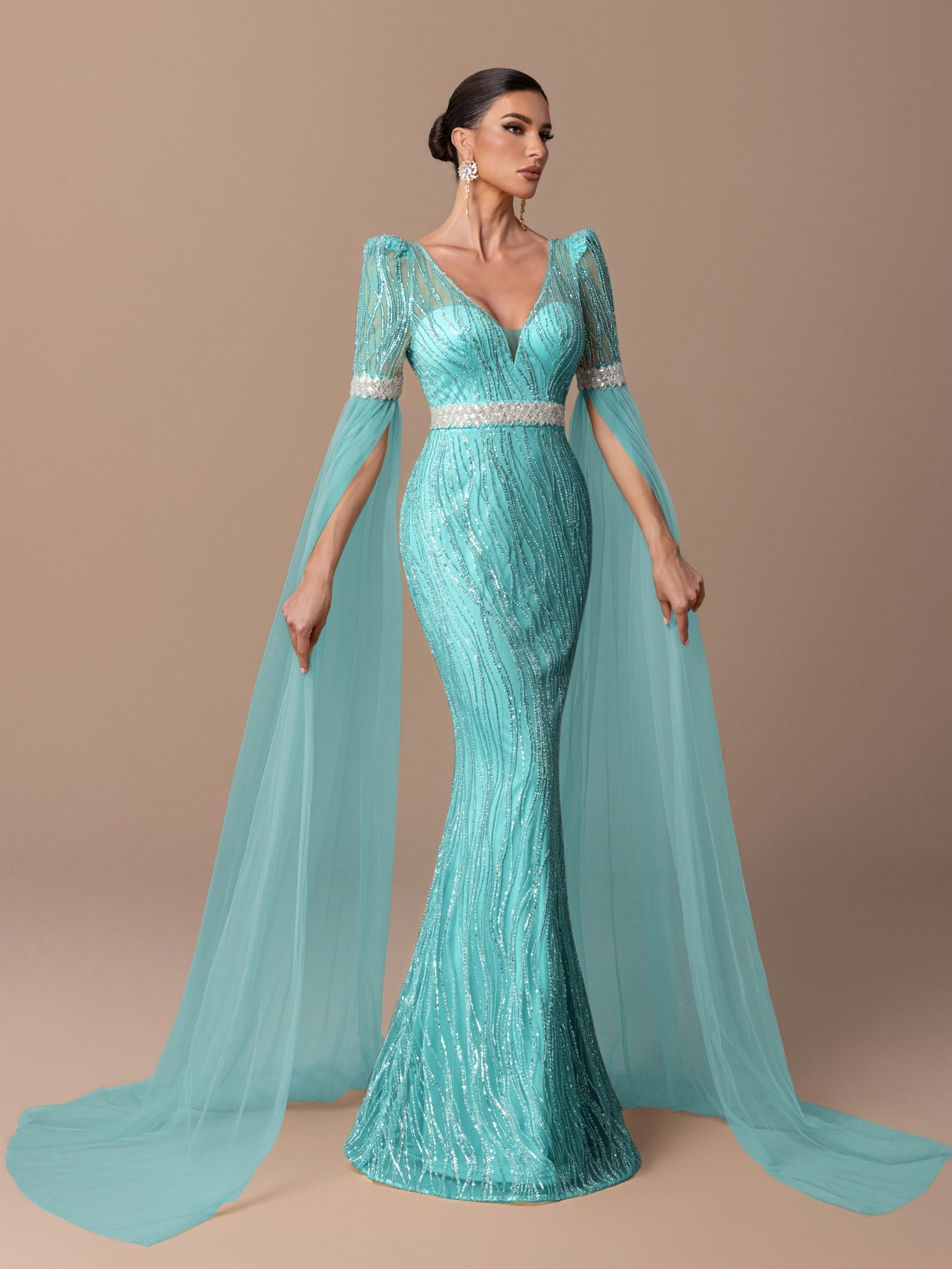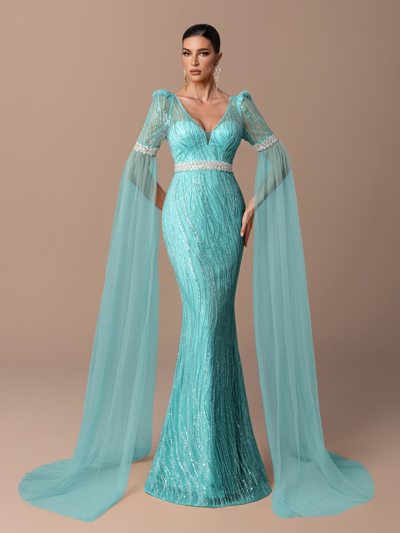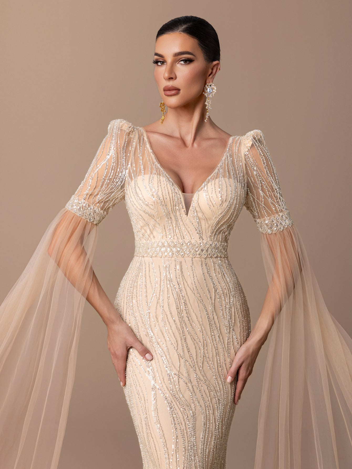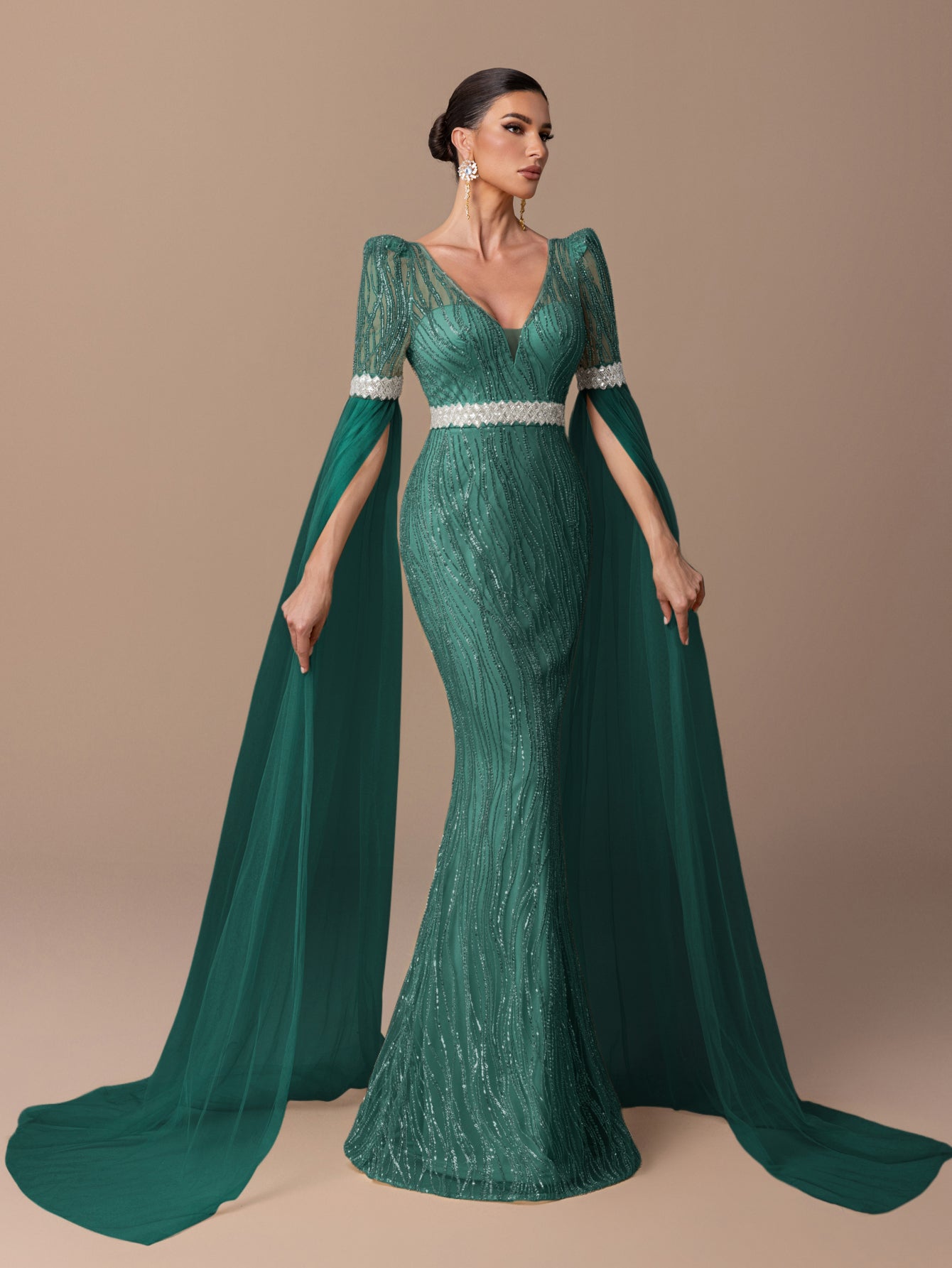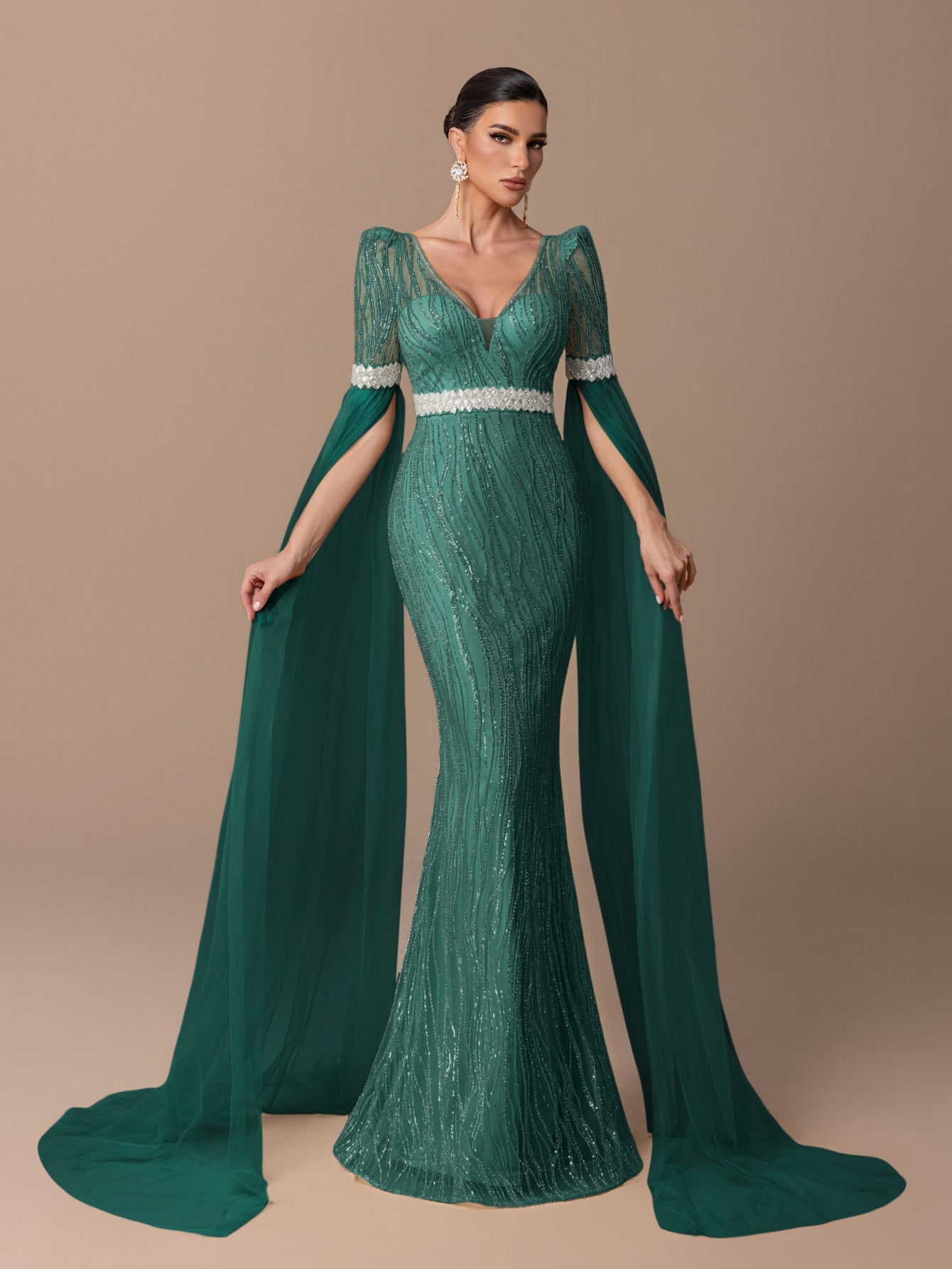 Beaded Sequin Mermaid Gown with Deep V-Neck, Sheer Tulle Sleeves