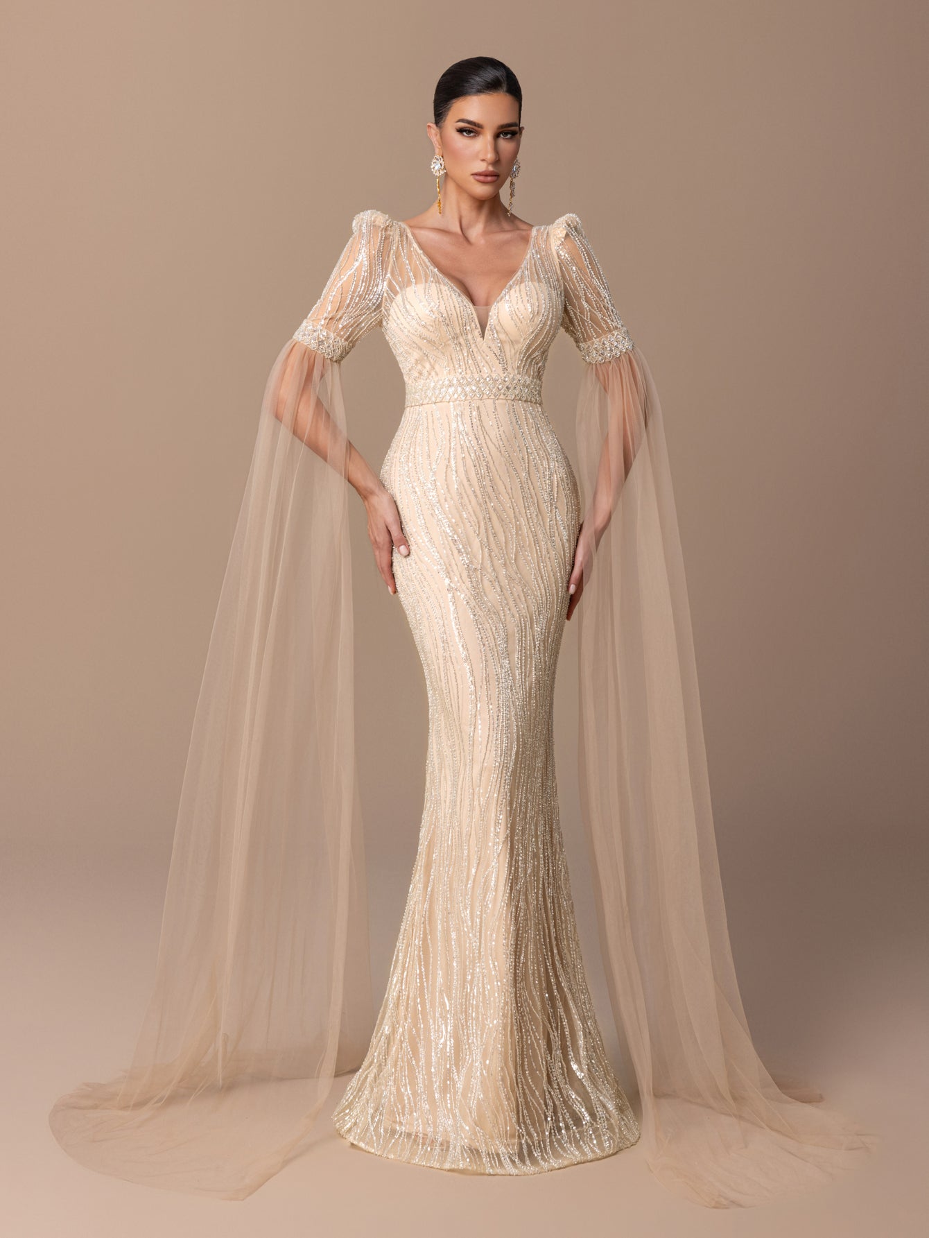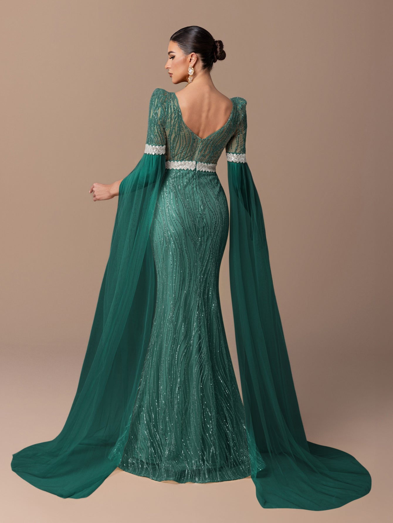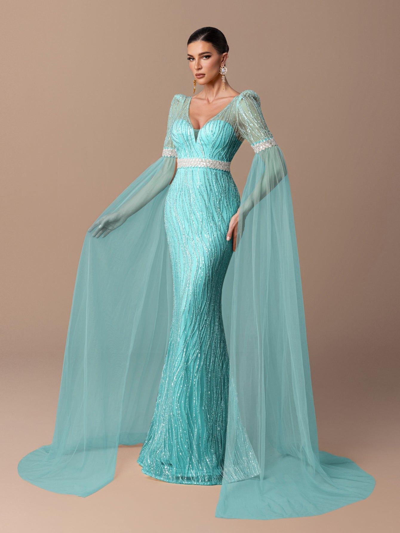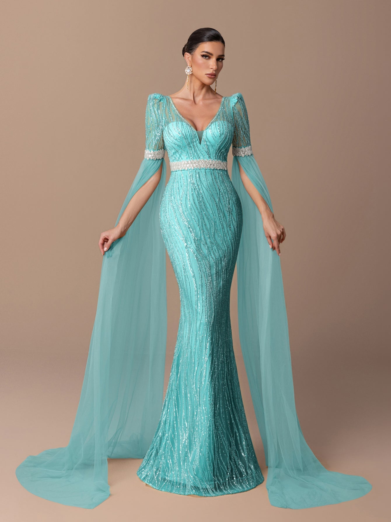 Beaded Sequin Mermaid Gown with Deep V-Neck, Sheer Tulle Sleeves