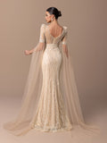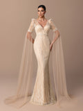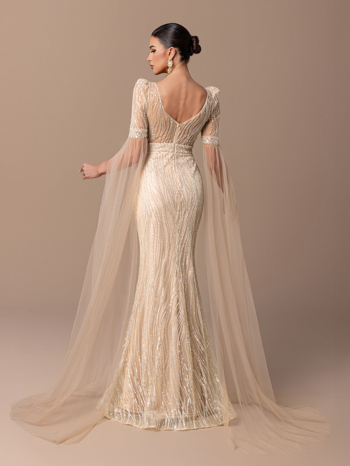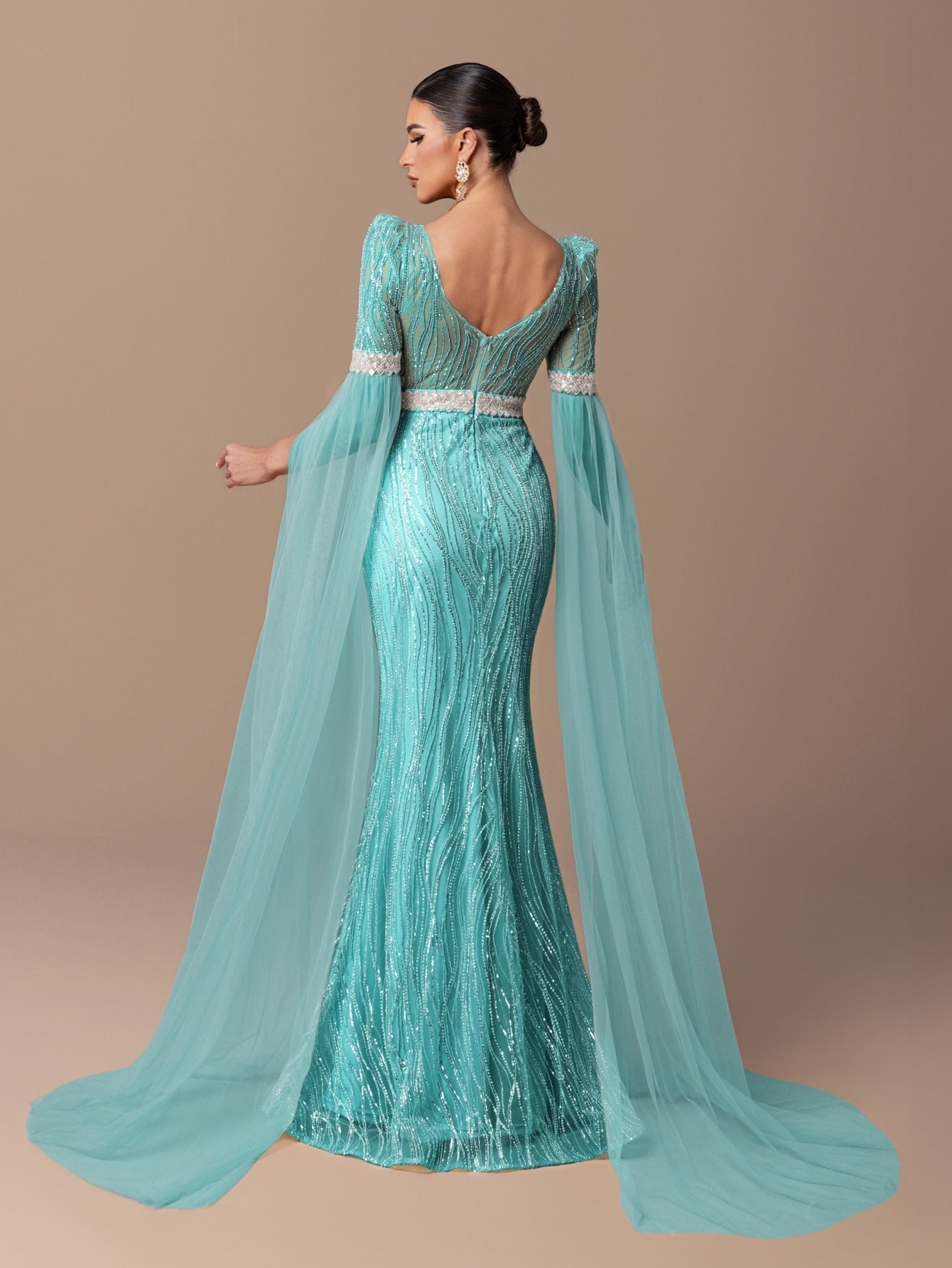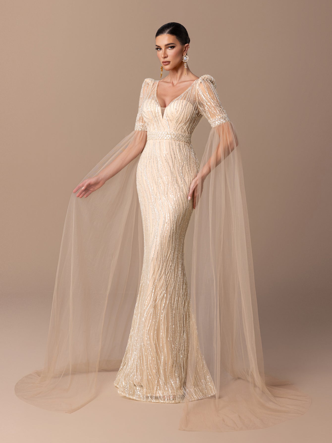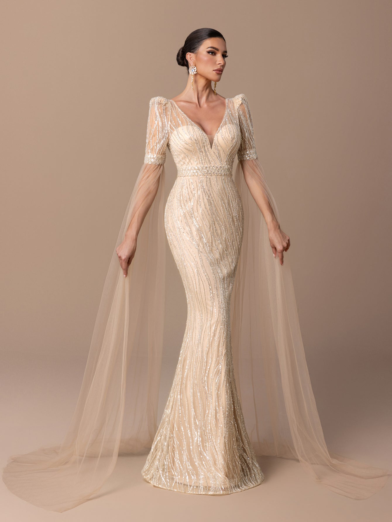 Beaded Sequin Mermaid Gown with Deep V-Neck, Sheer Tulle Sleeves