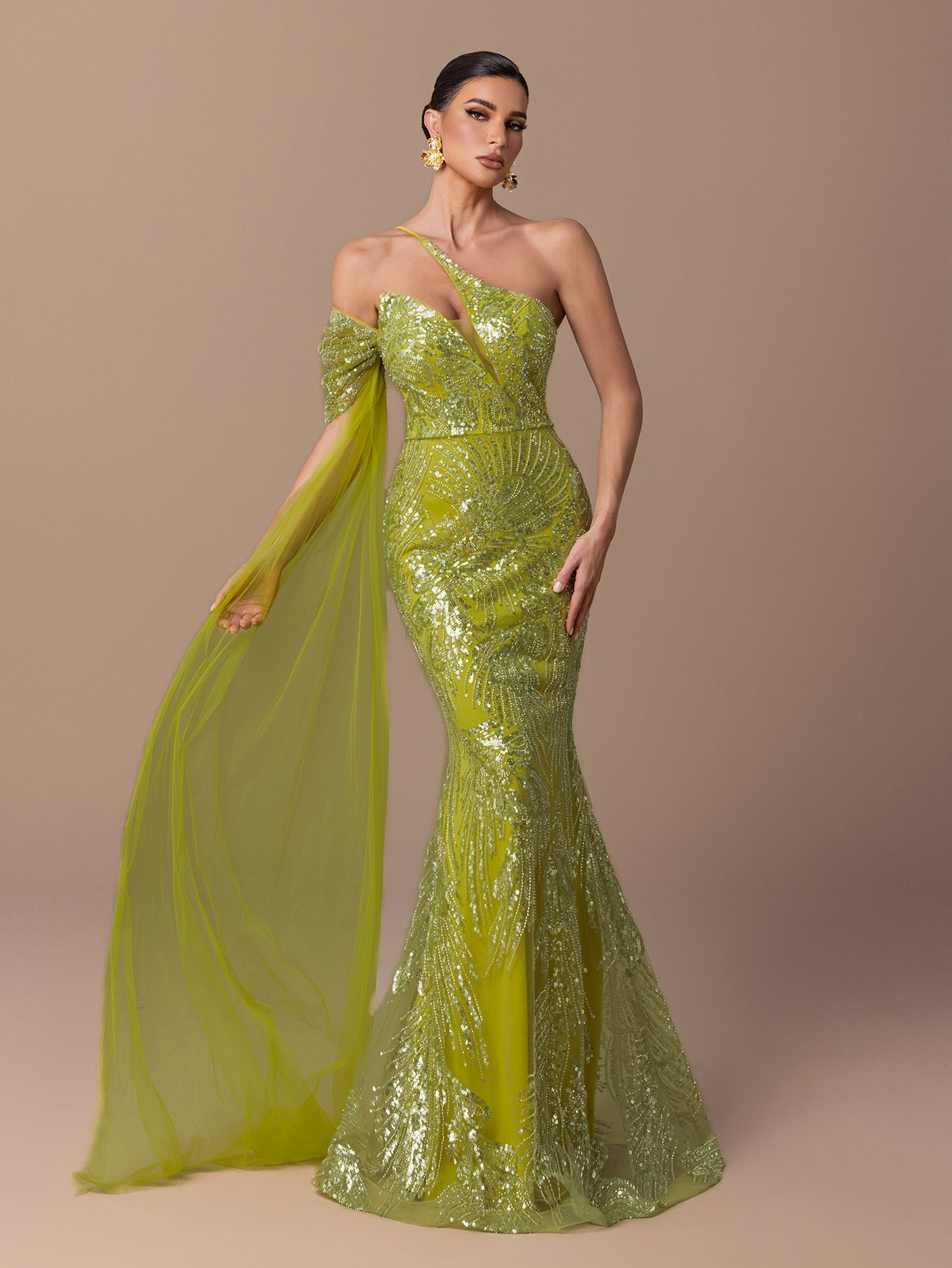 One-Shoulder Mermaid Gown with Sequins, Beads & Tulle Shawl