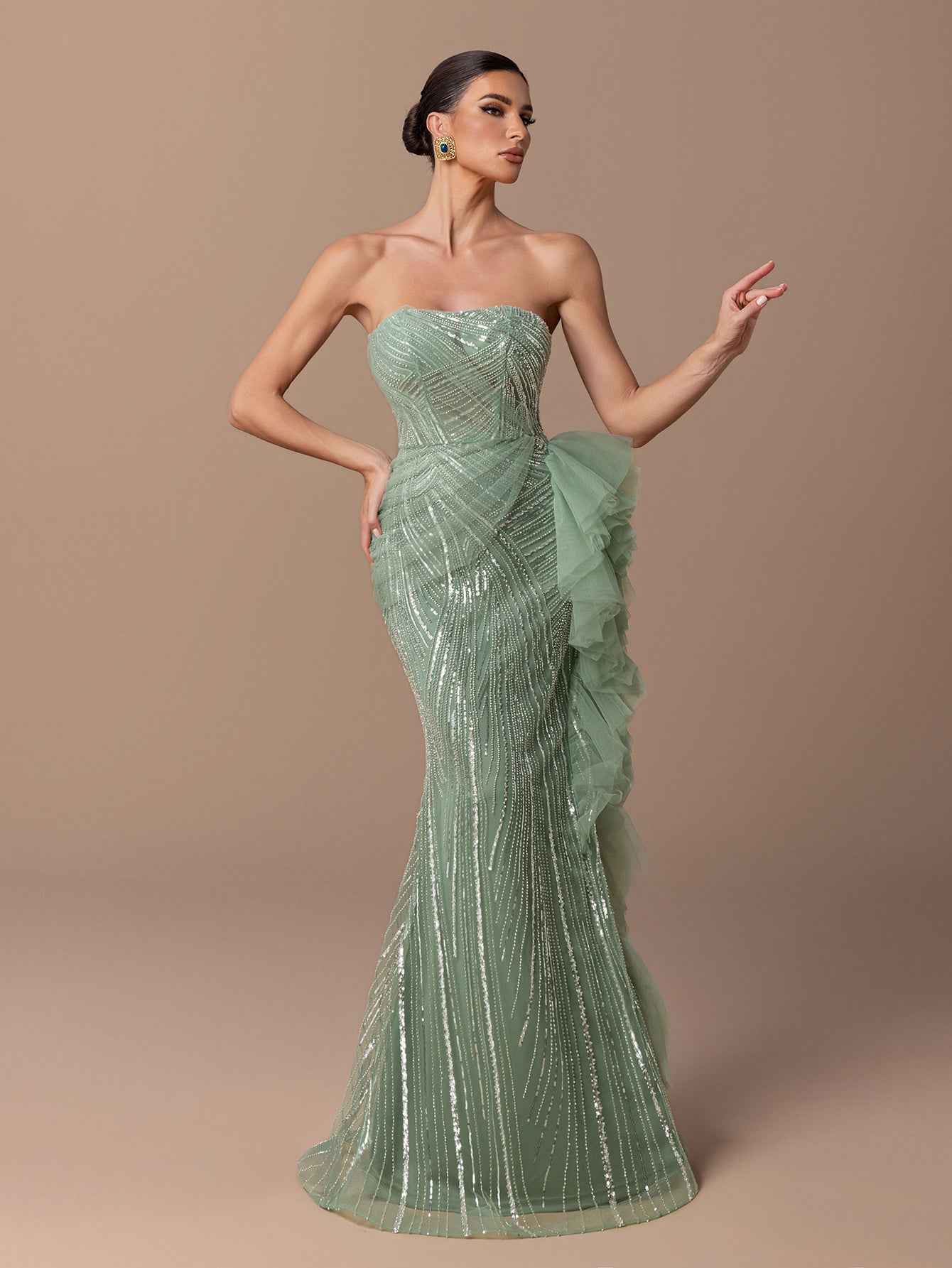 Strapless Mermaid Gown with Sequins, Waist Tie-Back & Tulle Ruffle