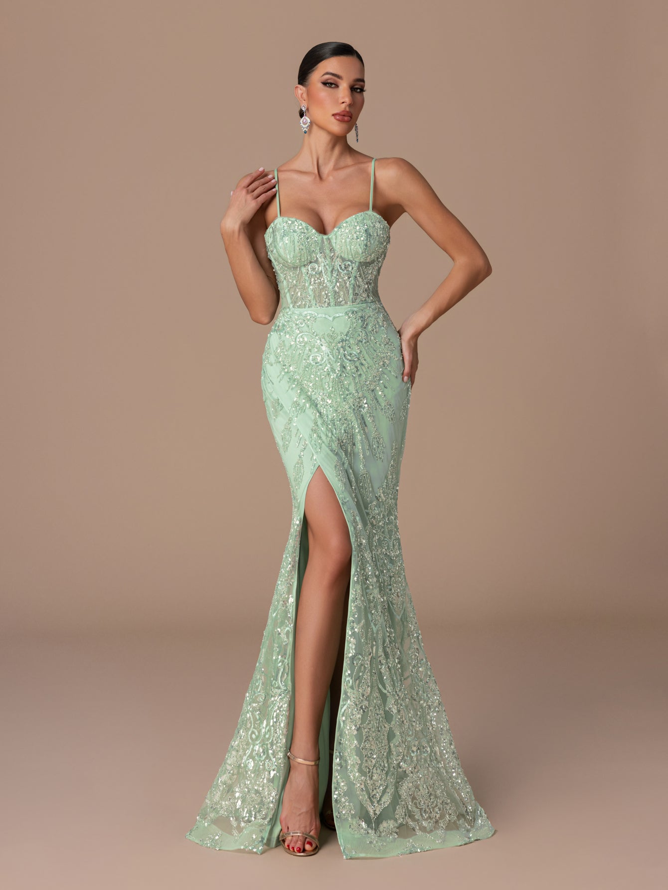 Mermaid Gown with Spaghetti Straps, Sequins/Beads and Cross-Back Straps