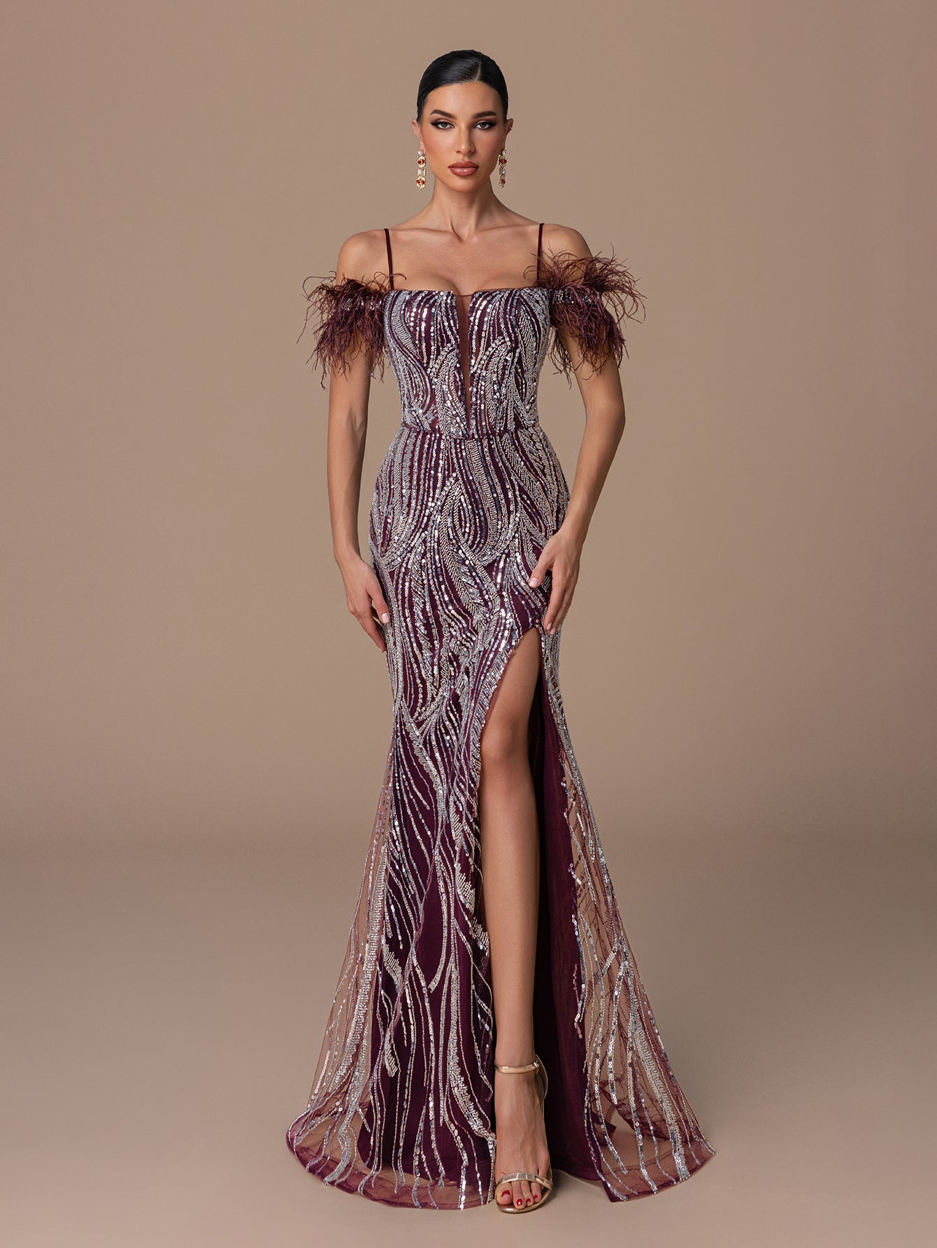 Mermaid Gown with Sequins, Feather Epaulettes & Criss Cross Back