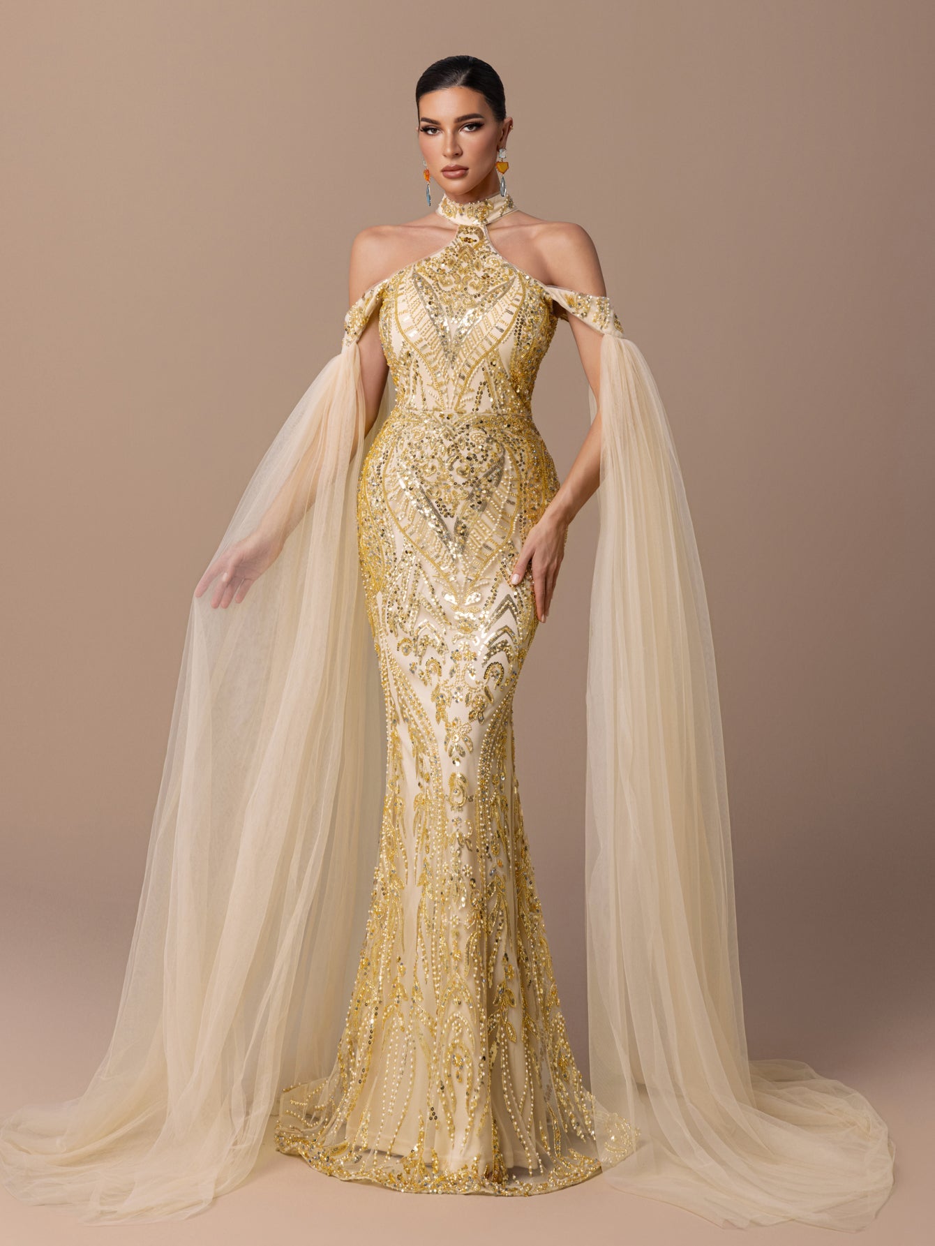 Mermaid Gown with  Sequins/Beads, Off-Shoulder High Neck & Flowing Tulle Shawl