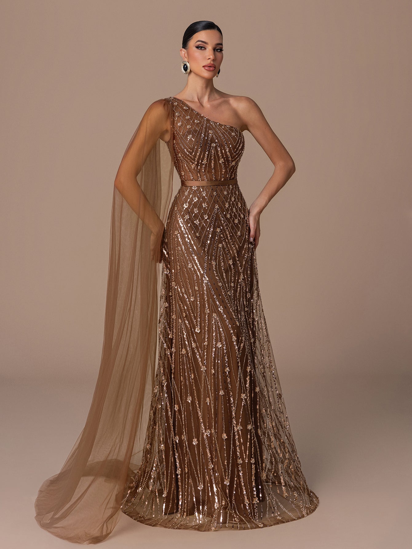 One-Shoulder Mermaid Gown with Sequins, Beads & Tulle Shawl