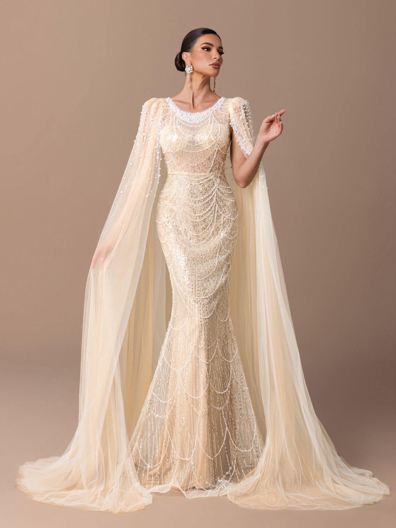 Mermaid Gown with Sequins, Tulle Shawl & Deep V Back Lacing