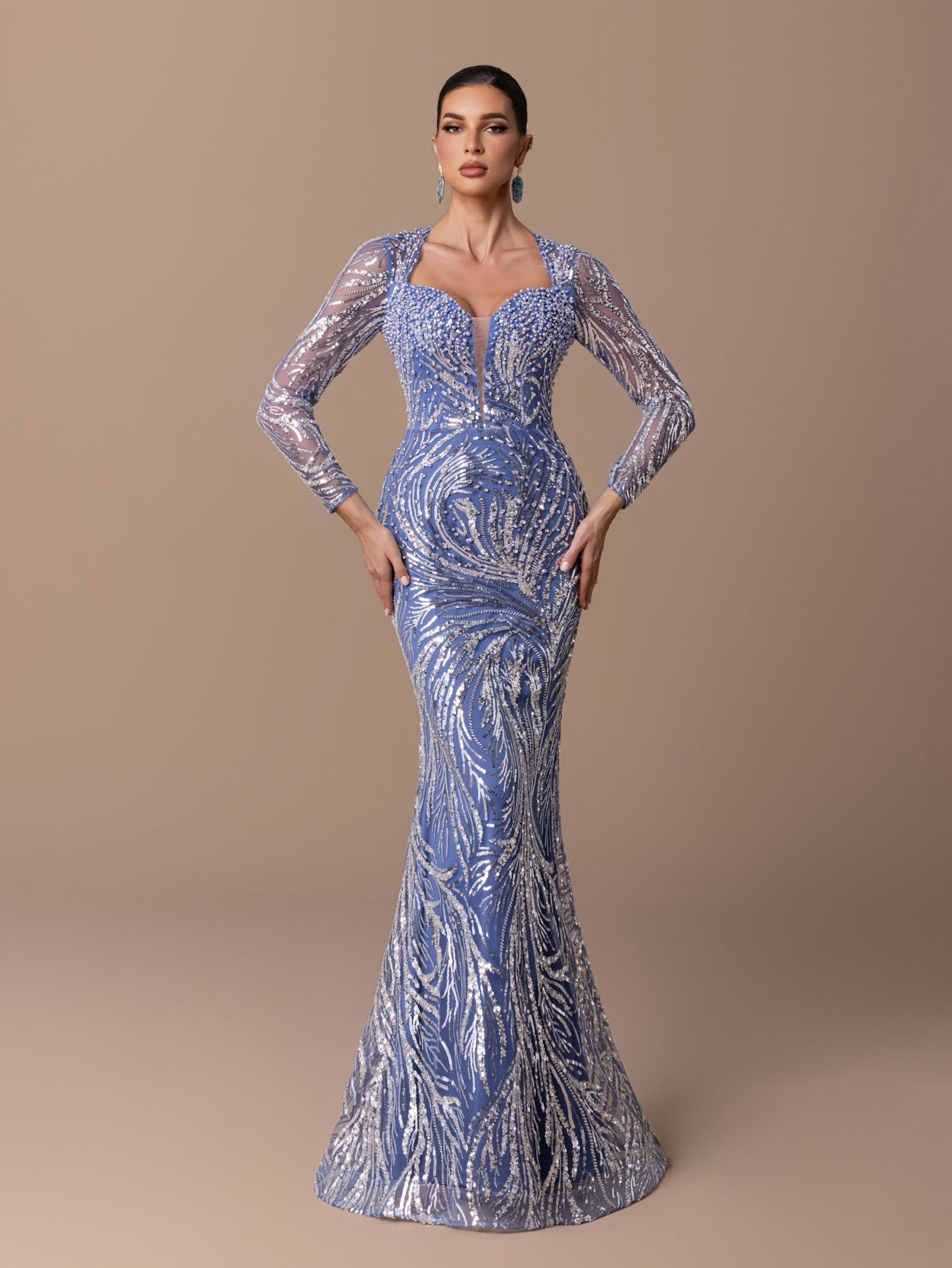 Mermaid Gown with Sheer Sleeves, Beads/Sequins & Fish-Tail Silhouette