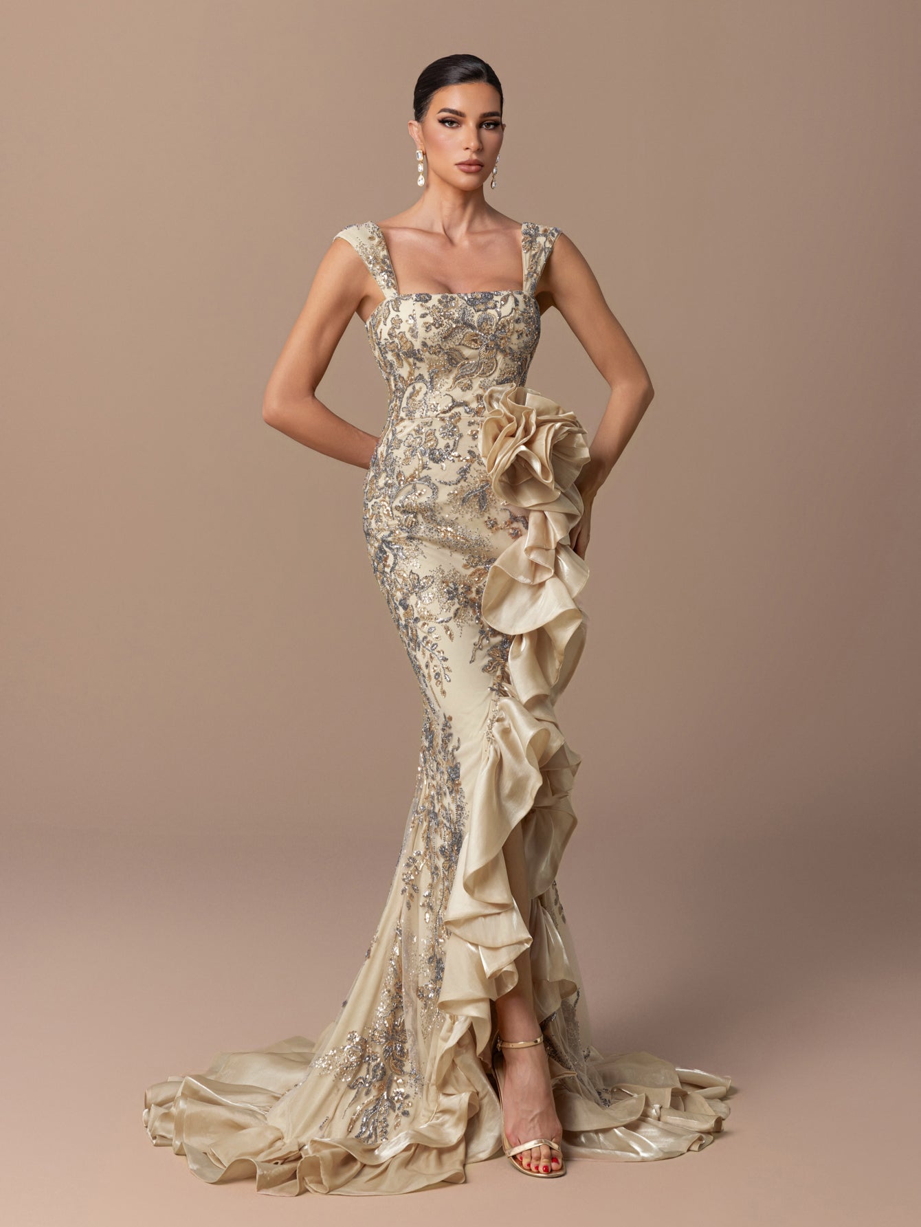Mermaid Gown with Square Neck, Beaded Sequins & Asymmetrical High Slit