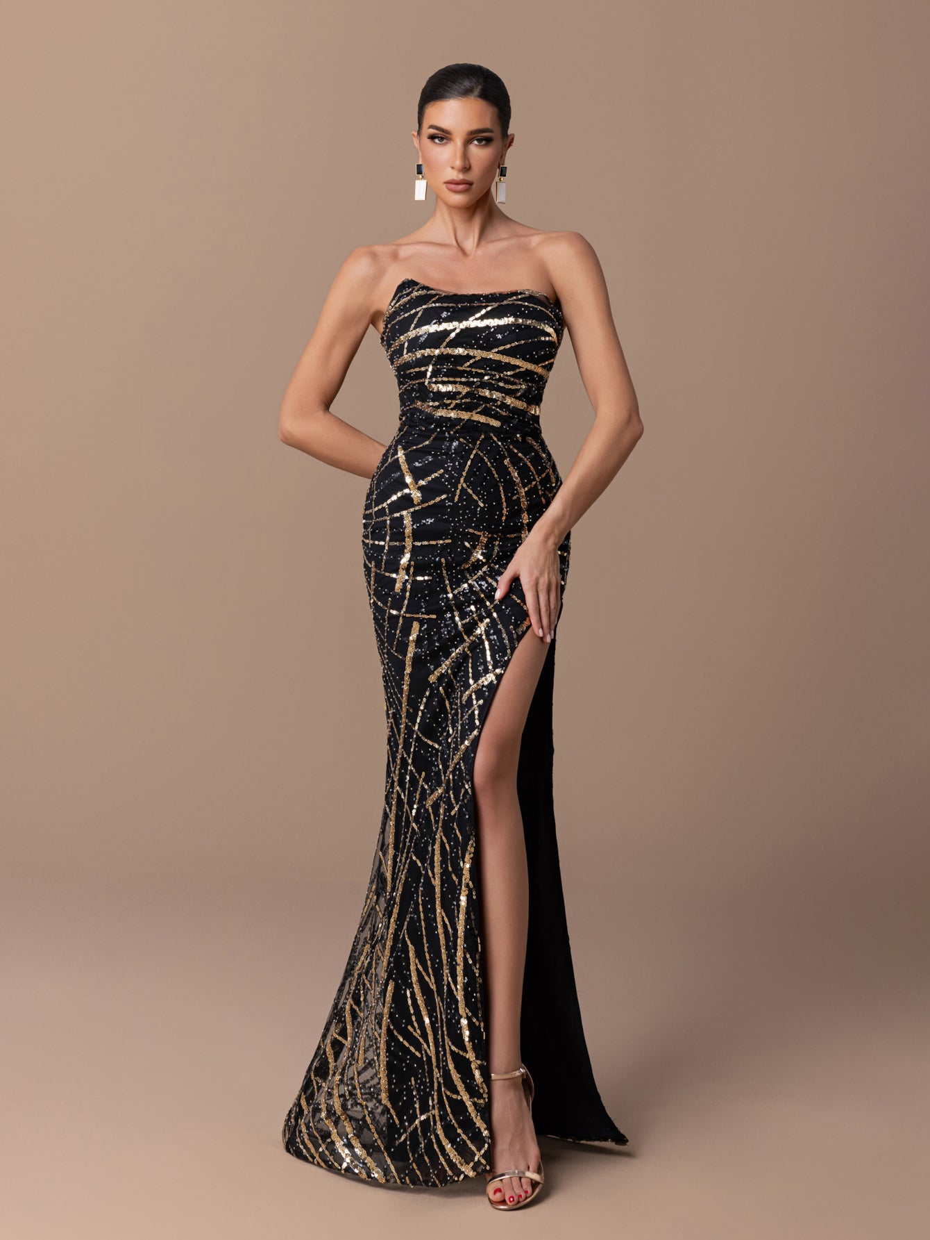 Strapless Mermaid Gown with Gold Geometric Sequins & High Slit