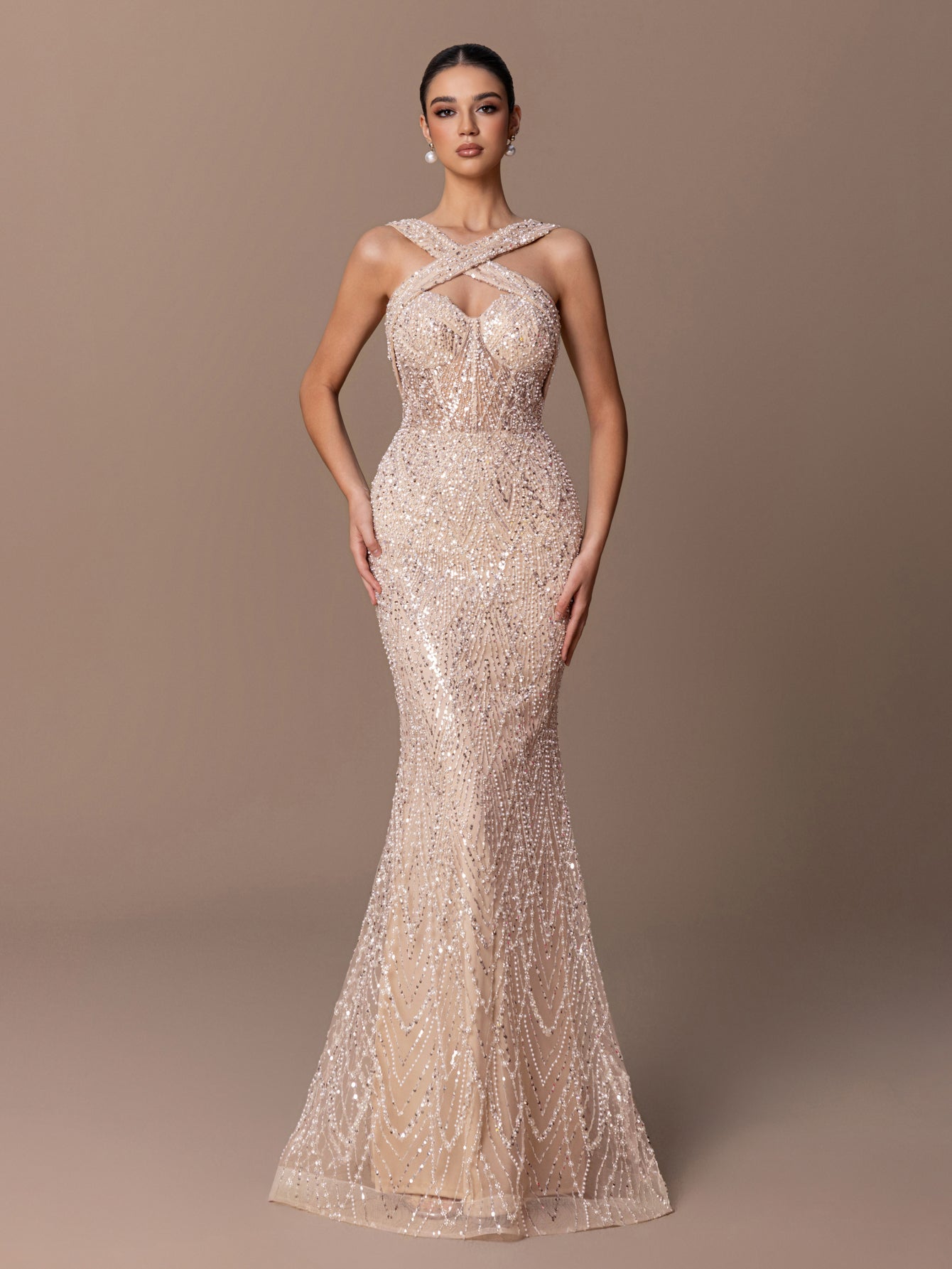 Criss Cross Halter Neck Mermaid Gown with Sequins, Beads and Cross-Strap V-Back