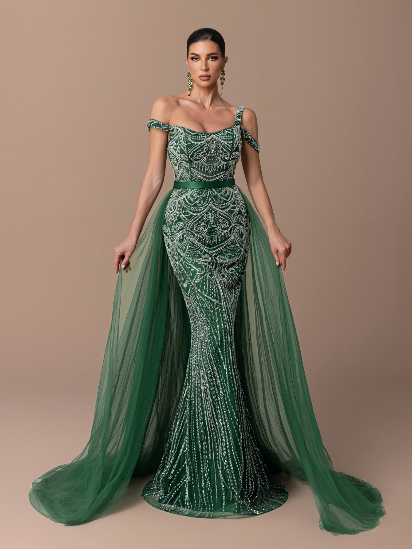 Off-Shoulder Mermaid Gown with Beaded Embroidery & Cross-Strapped Tulle Back