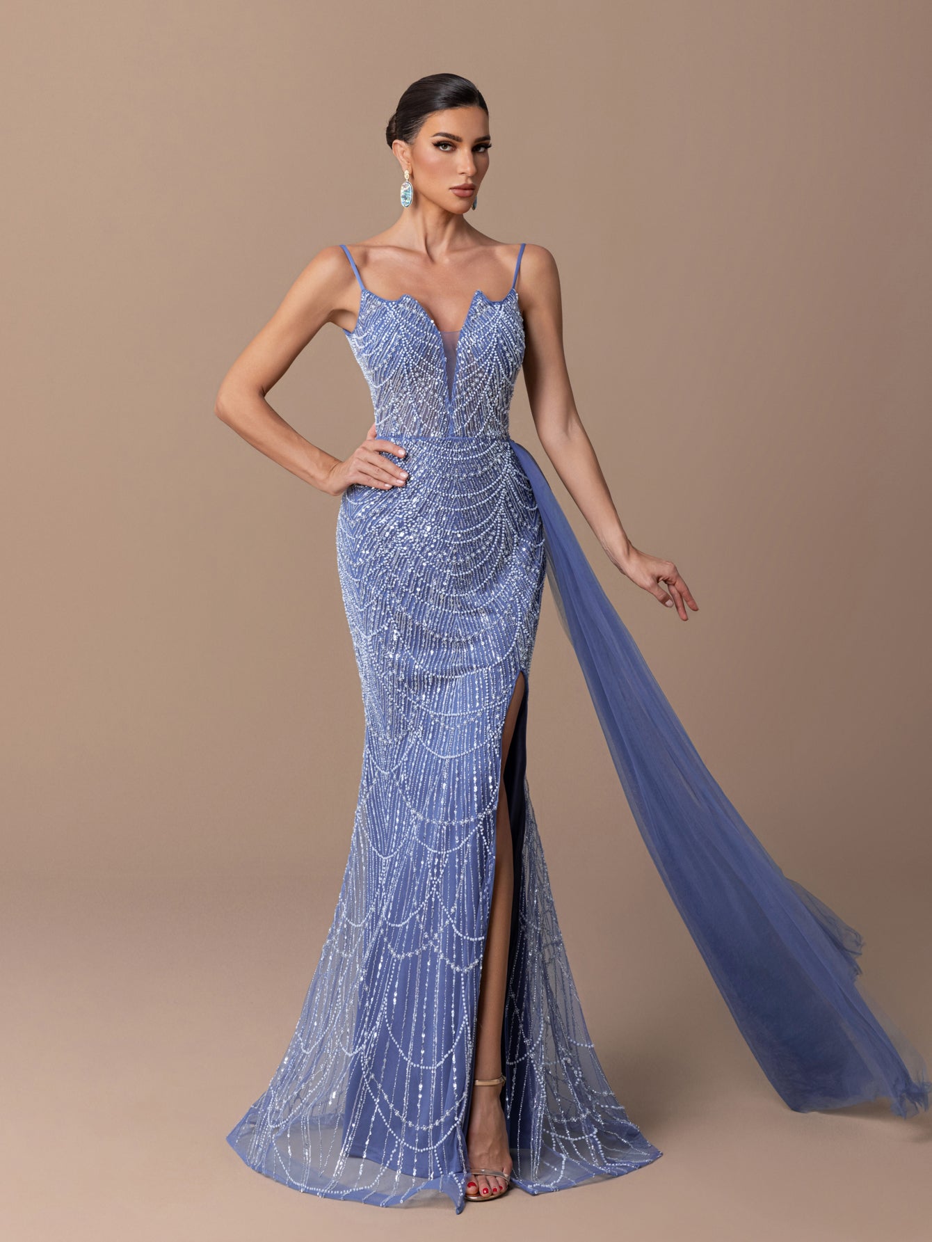 Mermaid Gown with Strappy Shoulders, Sequins & Beads, High Slit & Tulle Train