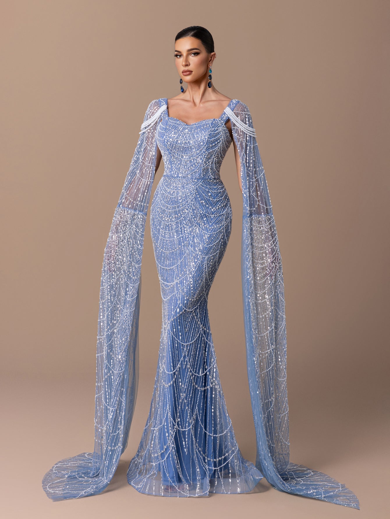 Mermaid Gown with Beaded Sequins, Shawl Sleeves & Back Crisscross Ties