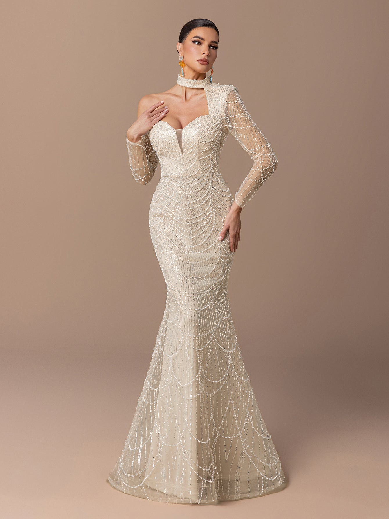 Mermaid Gown with One-Shoulder Long Sleeves, Beaded Sequins & Lace-Up Back