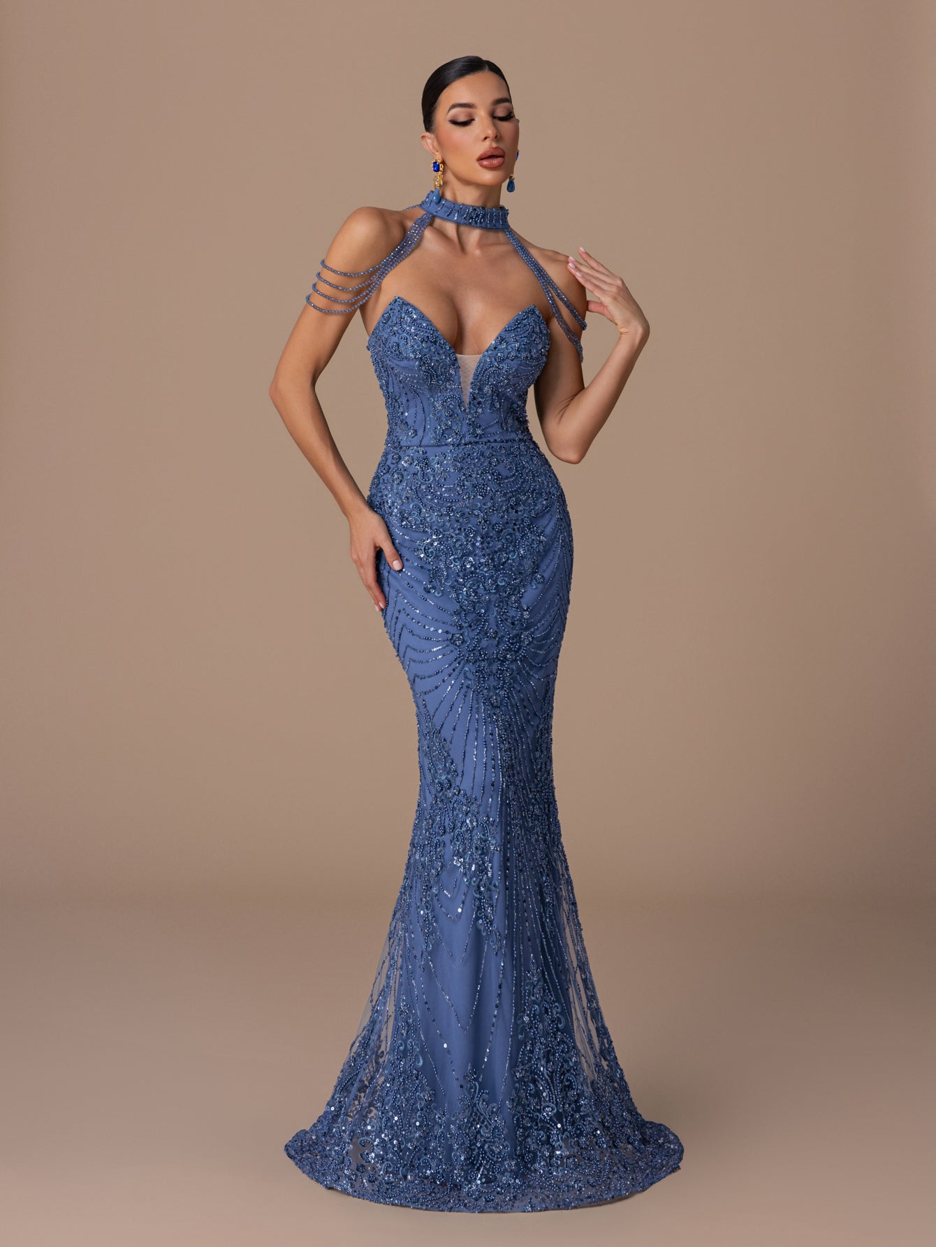 Strapless Mermaid Gown with Chain-Strap Shoulders, Beaded Sequins
