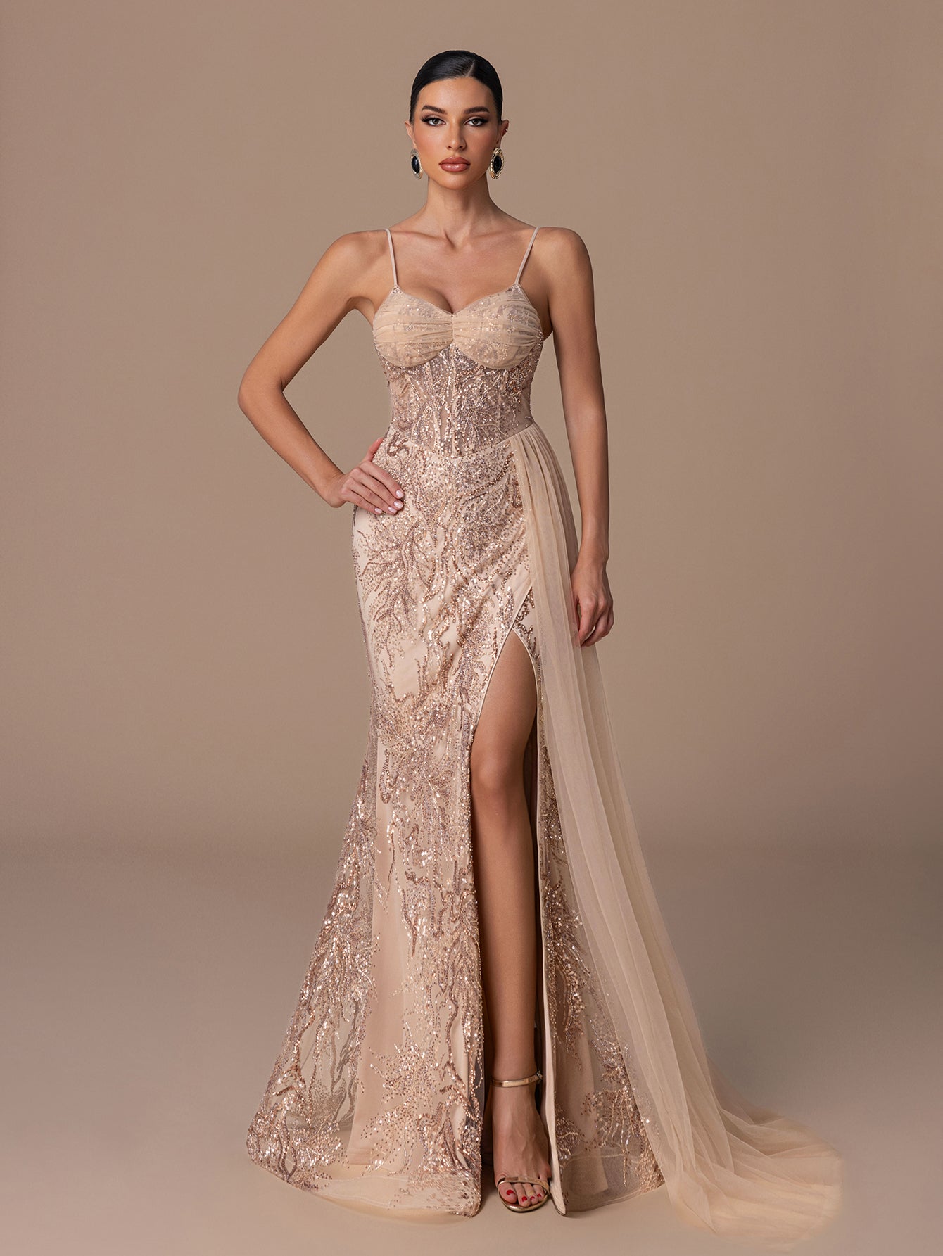 Mermaid Gown with Beaded Sequins & Asymmetrical Tulle Train