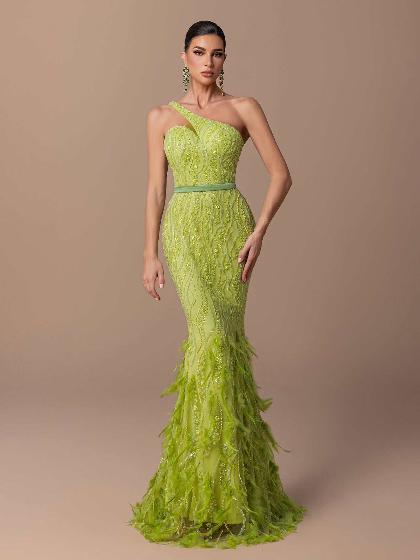 One-Shoulder Mermaid Gown with Beaded Sequin Embroidery & Feather Trim