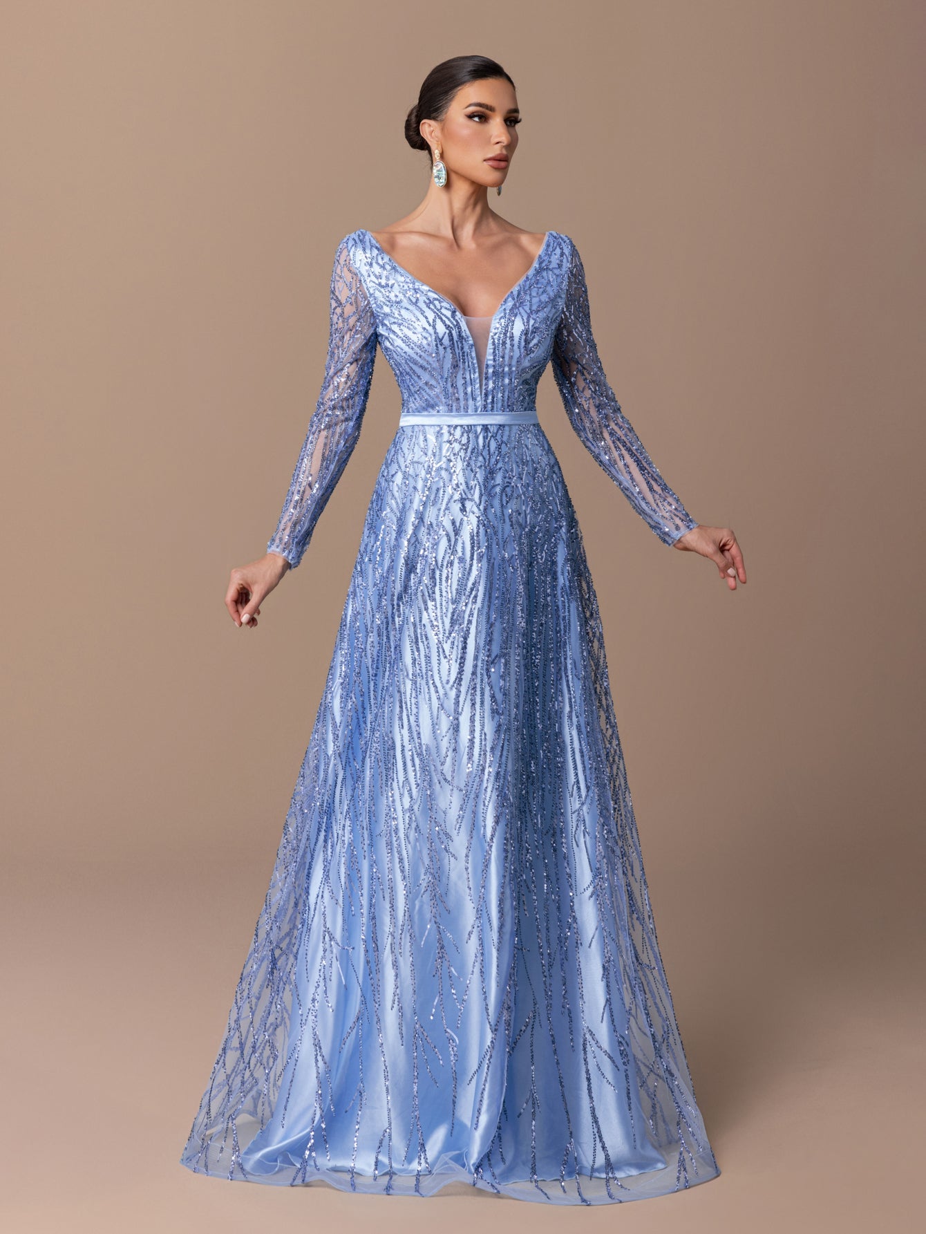 A-Line Gown with Beaded Sequins, Deep V-Neck & Cross-Strapped Back