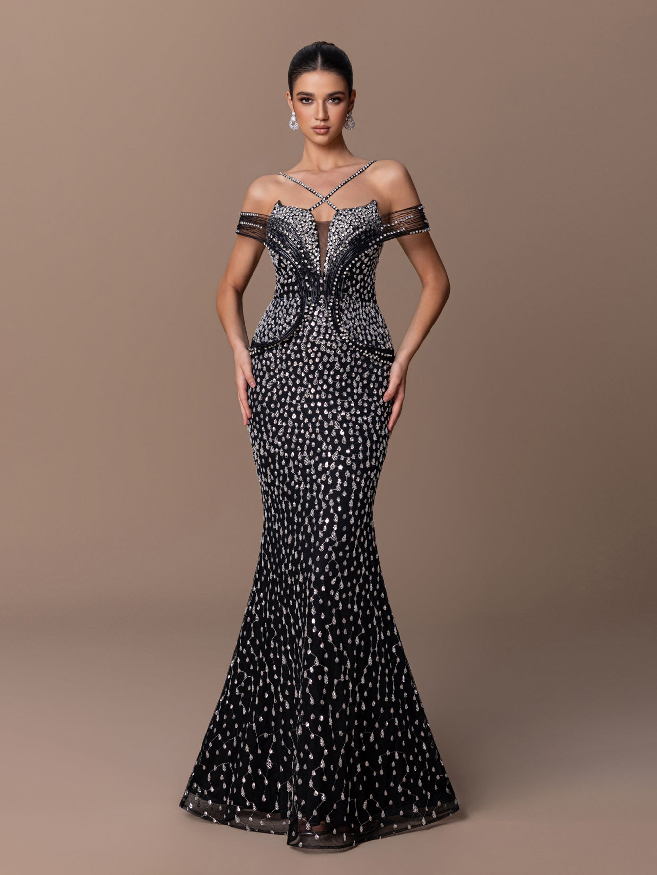 Off-Shoulder Mermaid Gown with Sequins, Beads & Cross-Strap V-Back Design