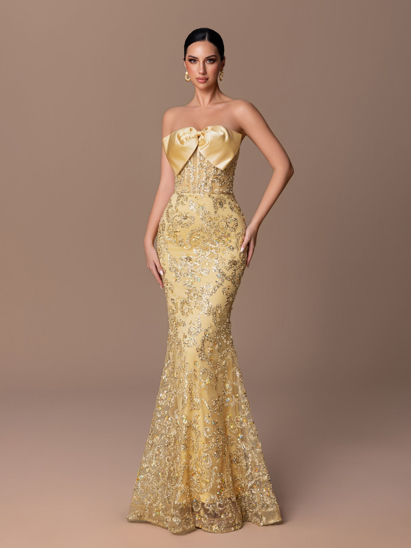 Strapless Mermaid Gown with Floral Beads Embroidery, Sequins and Bow