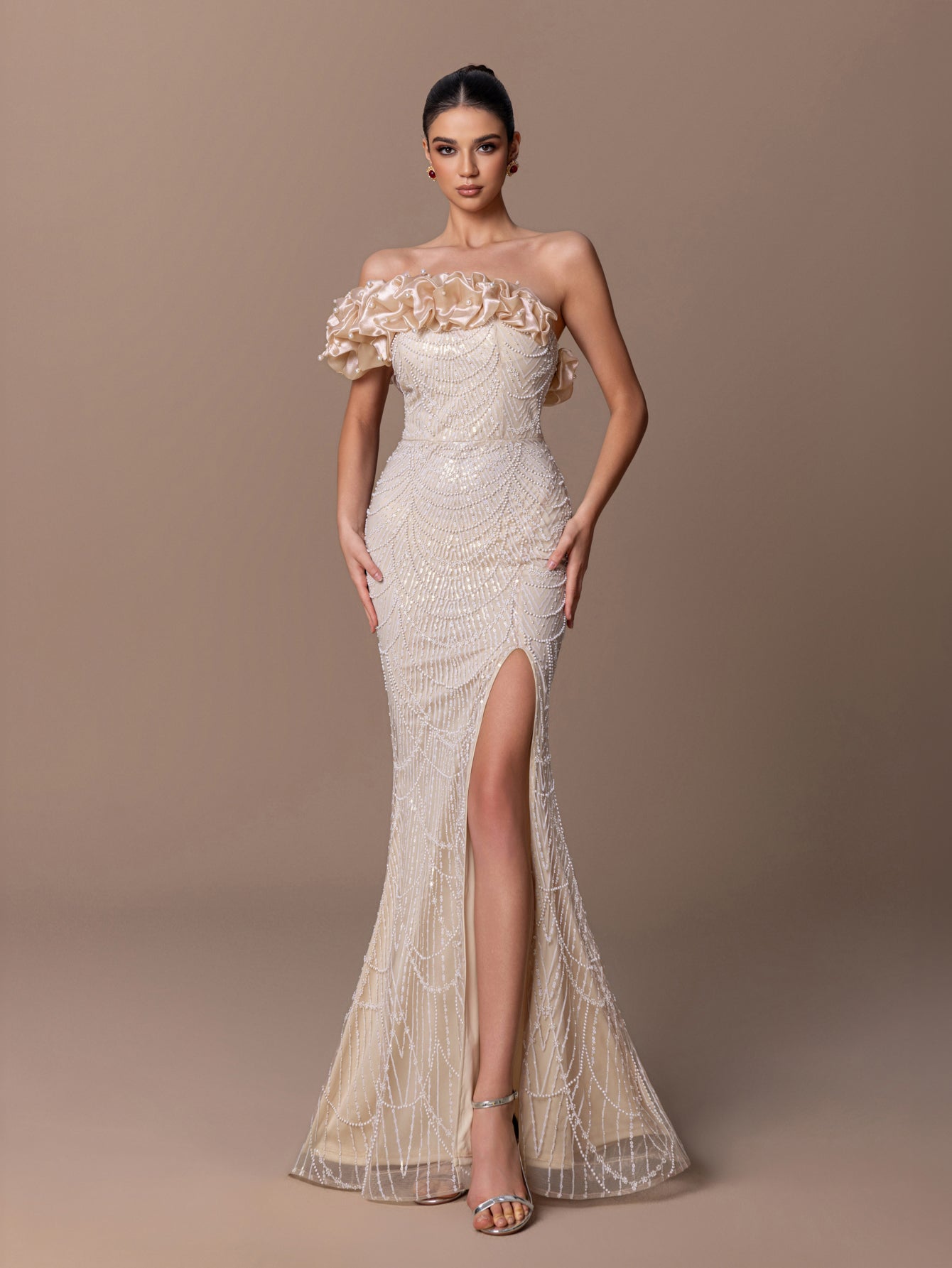 Off-Shoulder Mermaid Gown with Beaded Sequins & Fitted Bodice