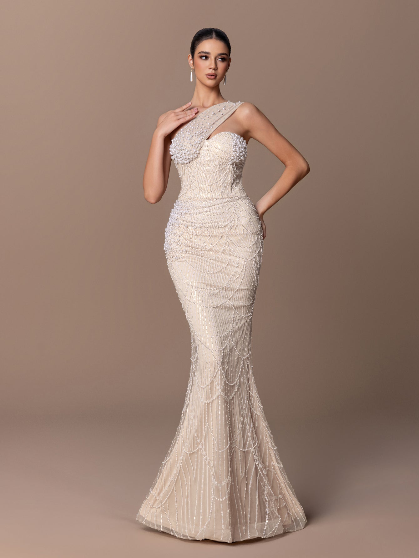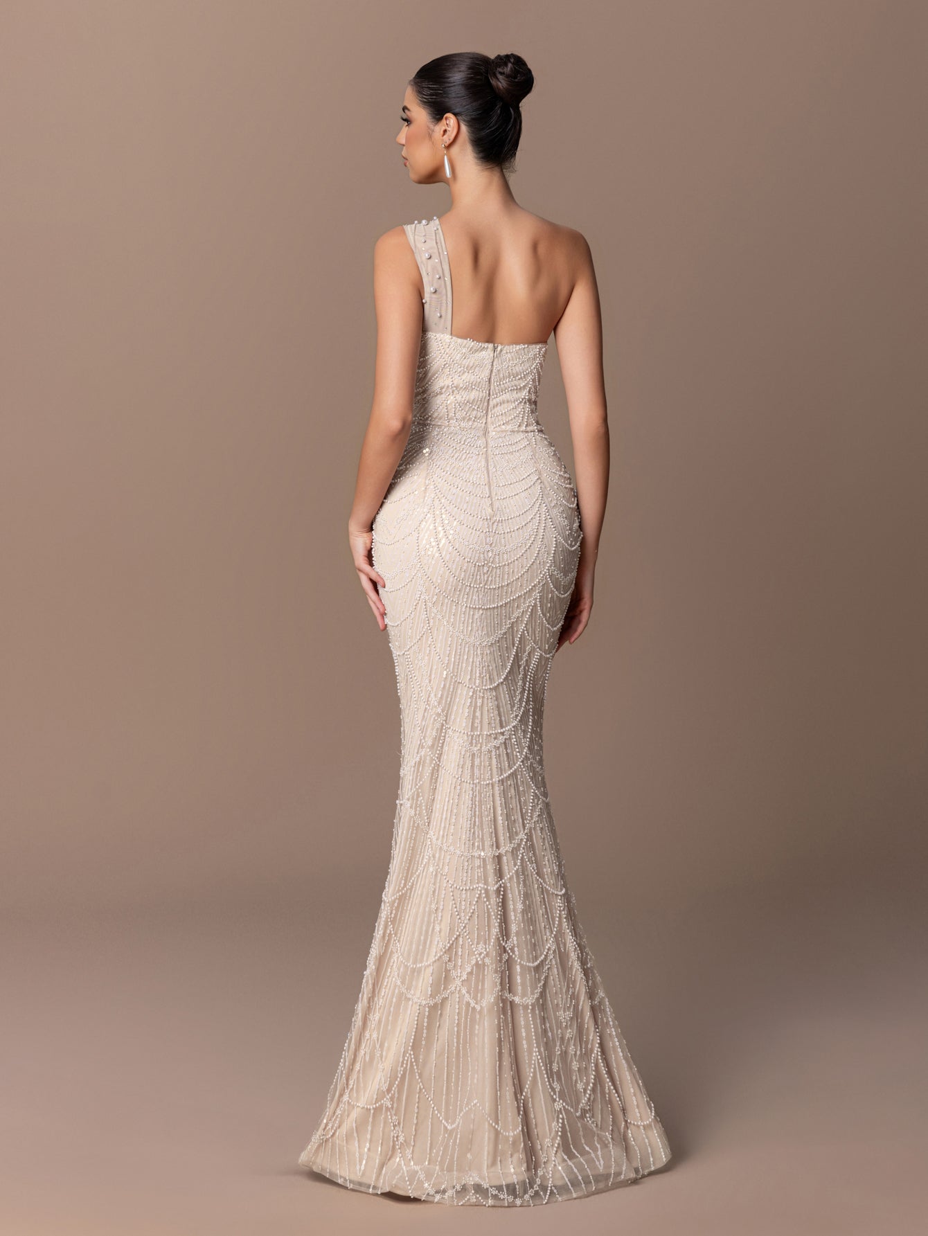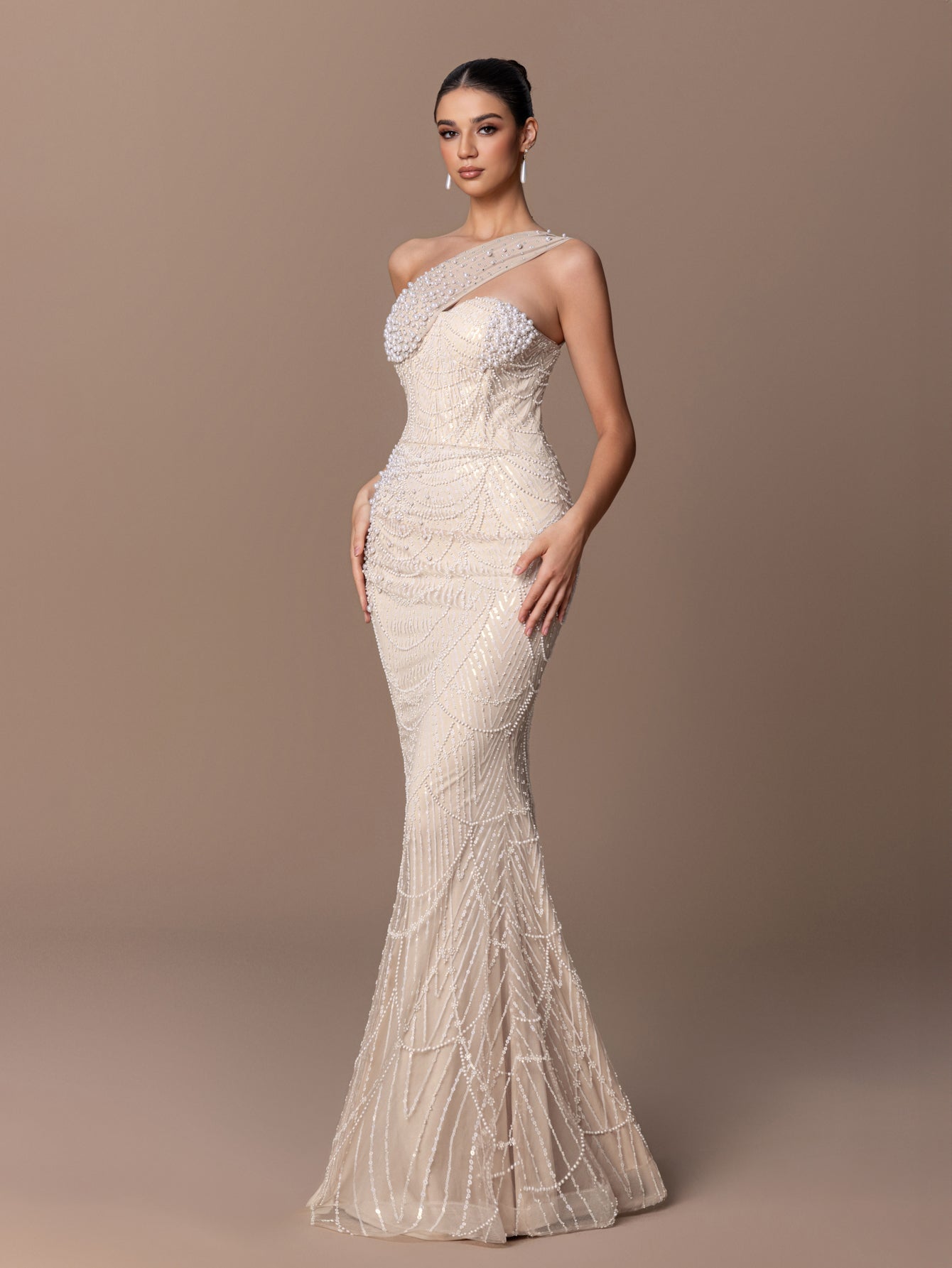 One-Shoulder Mermaid Gown with Layered Scaly BEaded Sequins & Asymmetric Strap