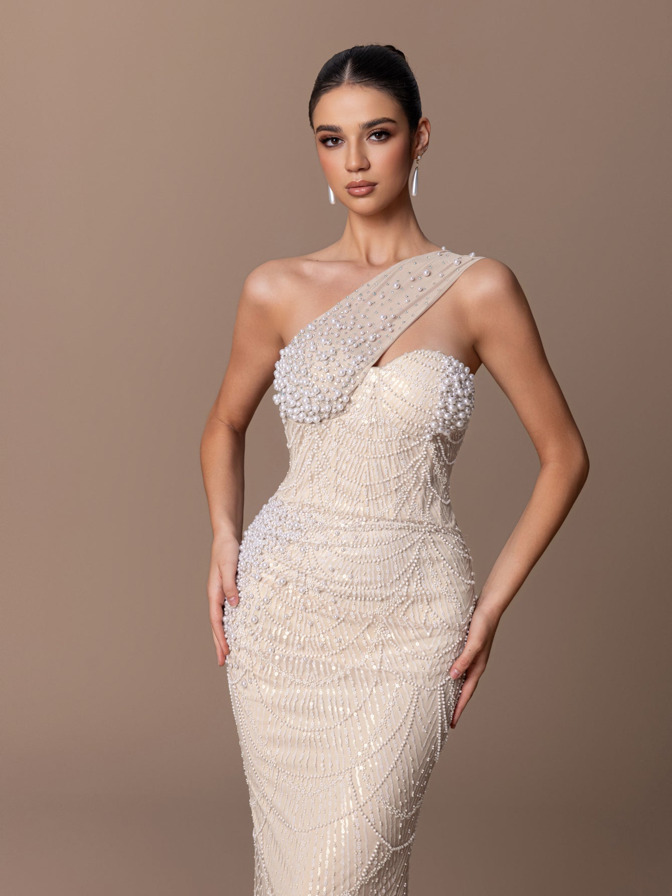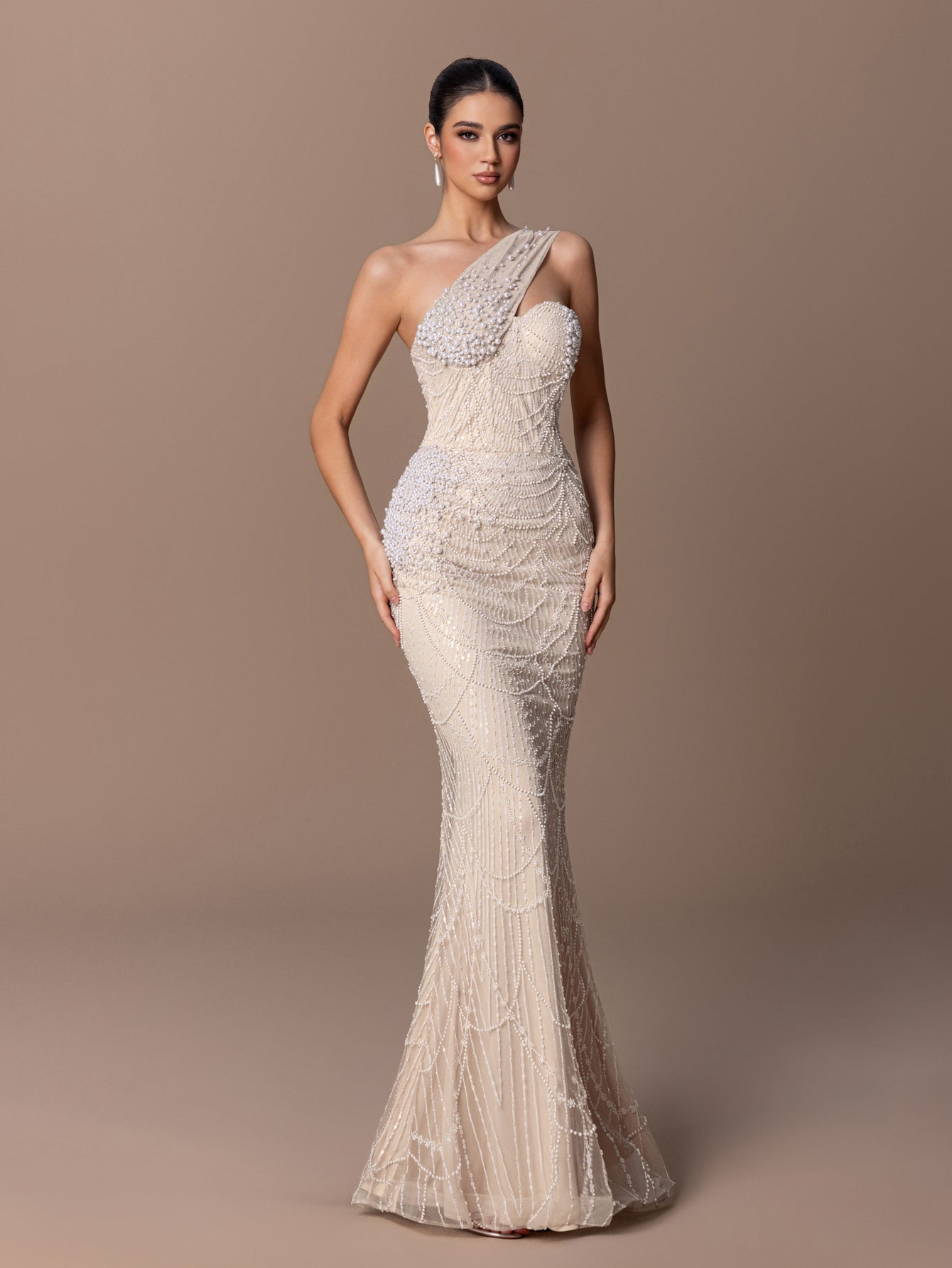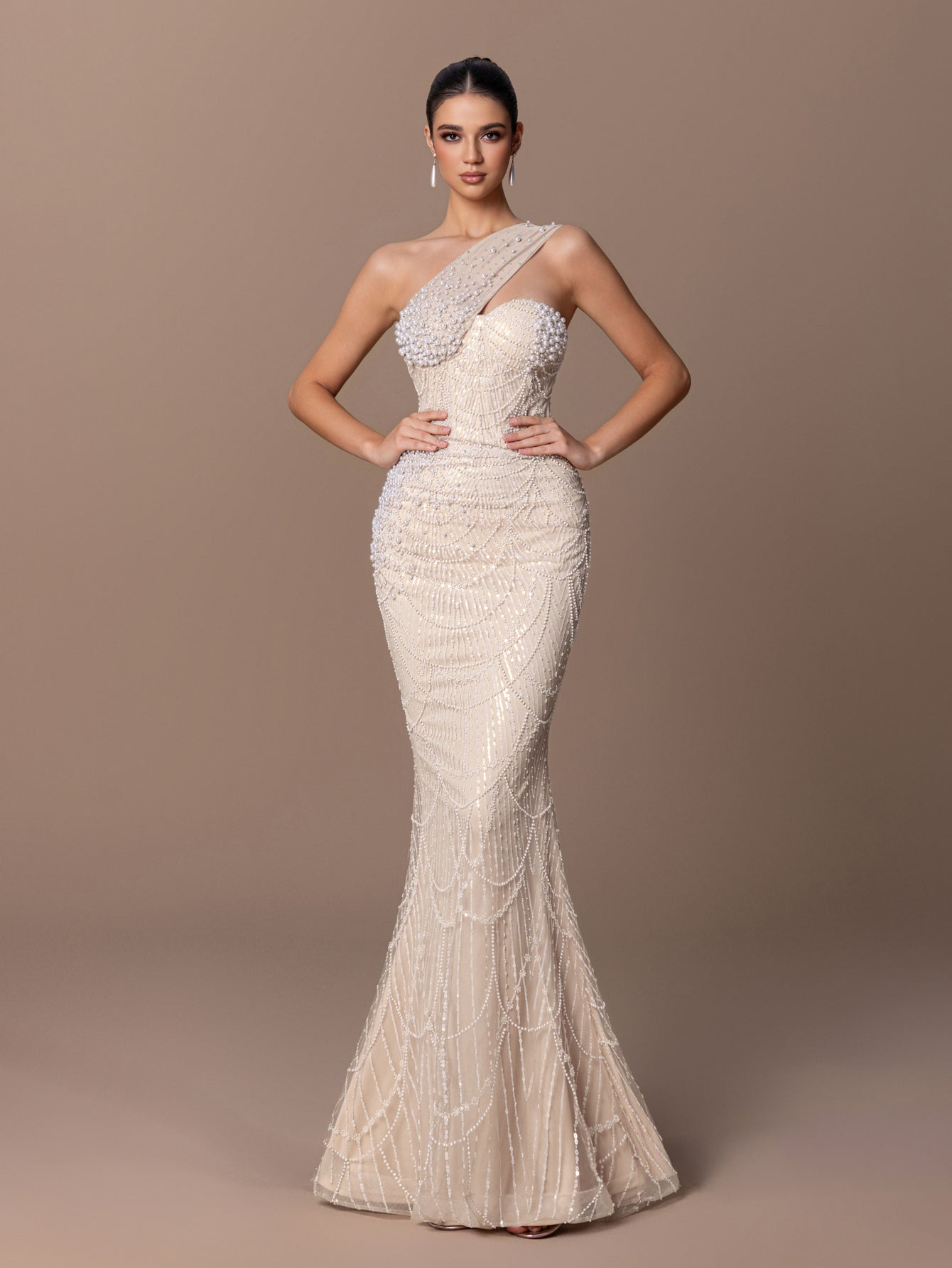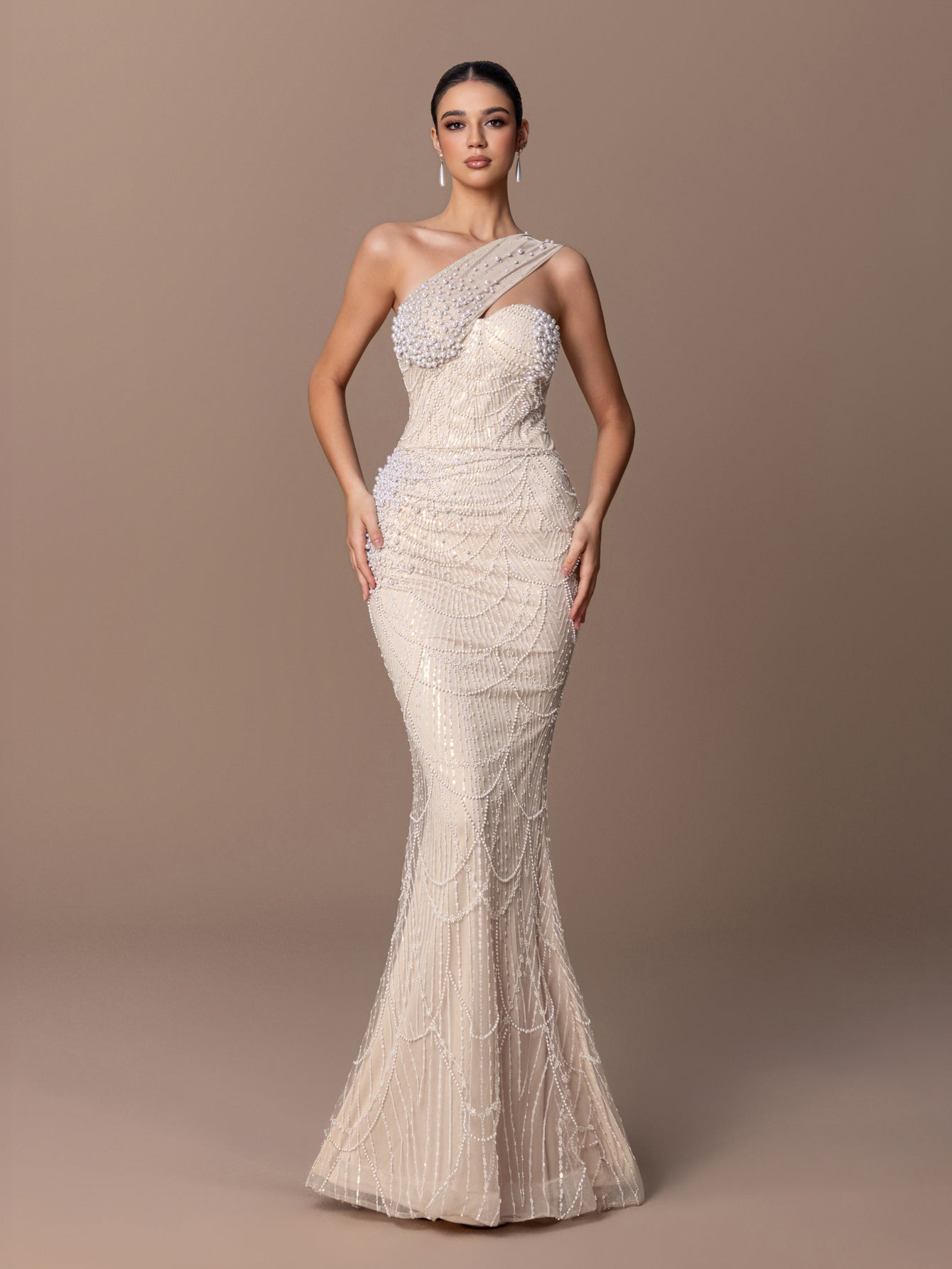 One-Shoulder Mermaid Gown with Layered Scaly BEaded Sequins & Asymmetric Strap