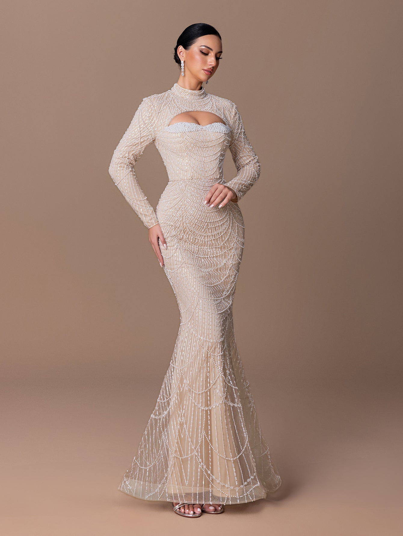High-Neck Mermaid Gown with Beaded Sequins & Hollowed Back Design