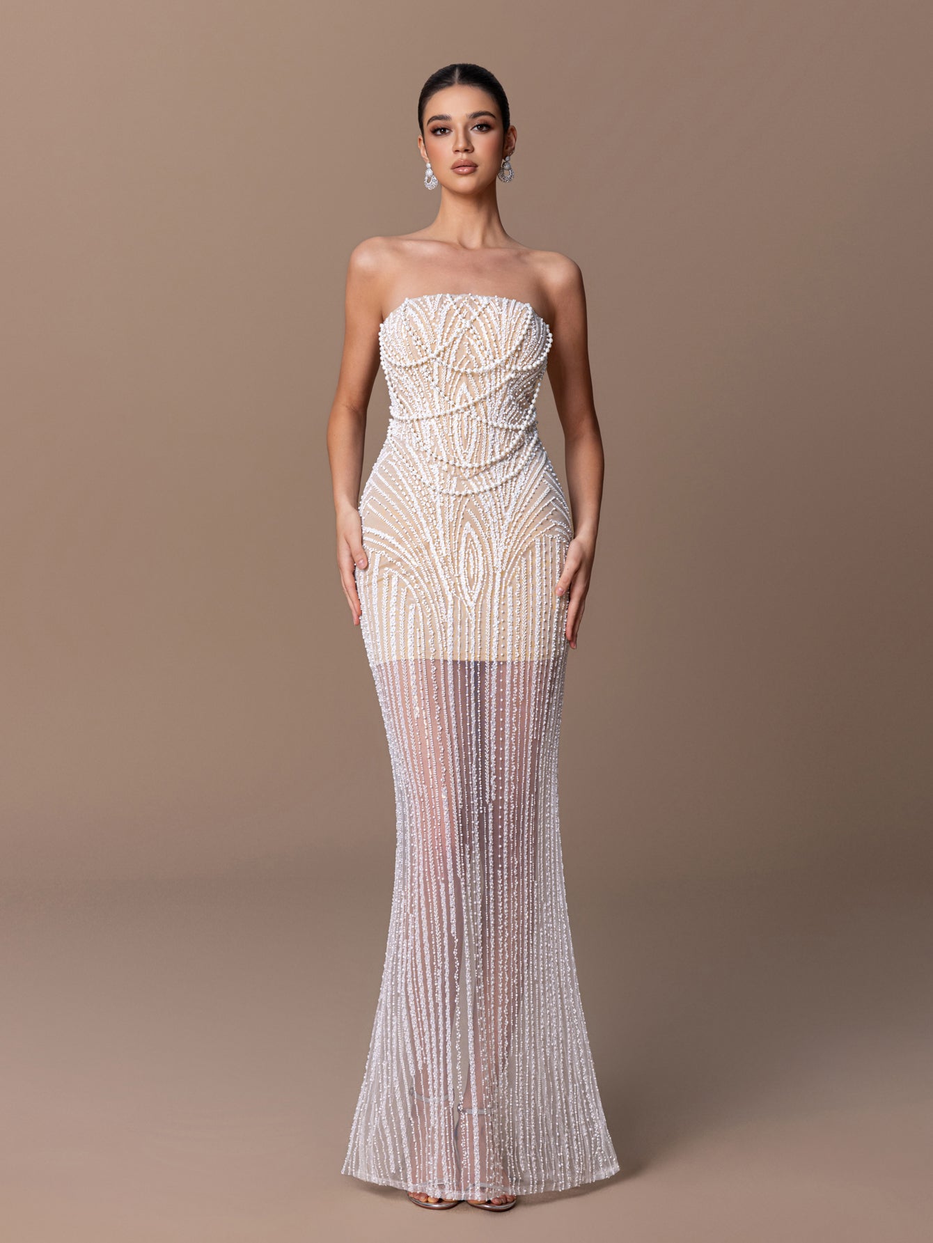 Strapless Mermaid Gown with Beaded Geometric Patterns, Sequin Embroidery & Tulle Vertical Stripes