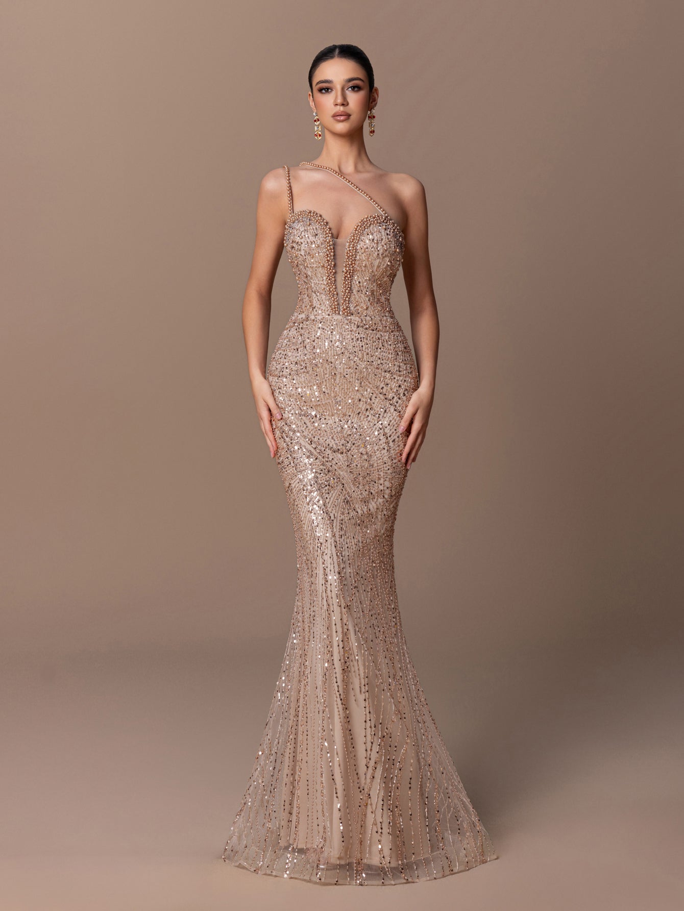 One-Shoulder Mermaid Gown with V-neck Beaded Sequins & Sheer Tulle Skirt