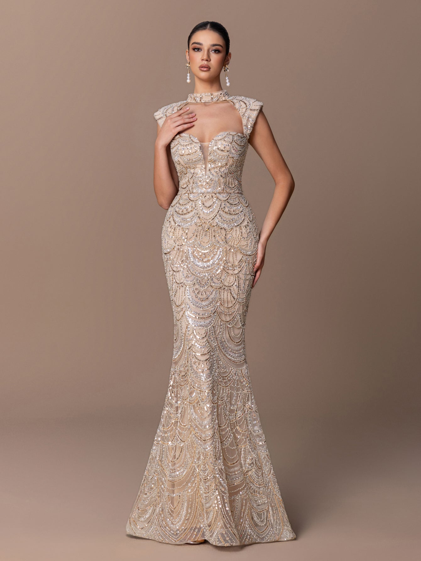 Mermaid Gown with Fan-Shaped Sequin Bead Embellishments, High-Neck & Open Back