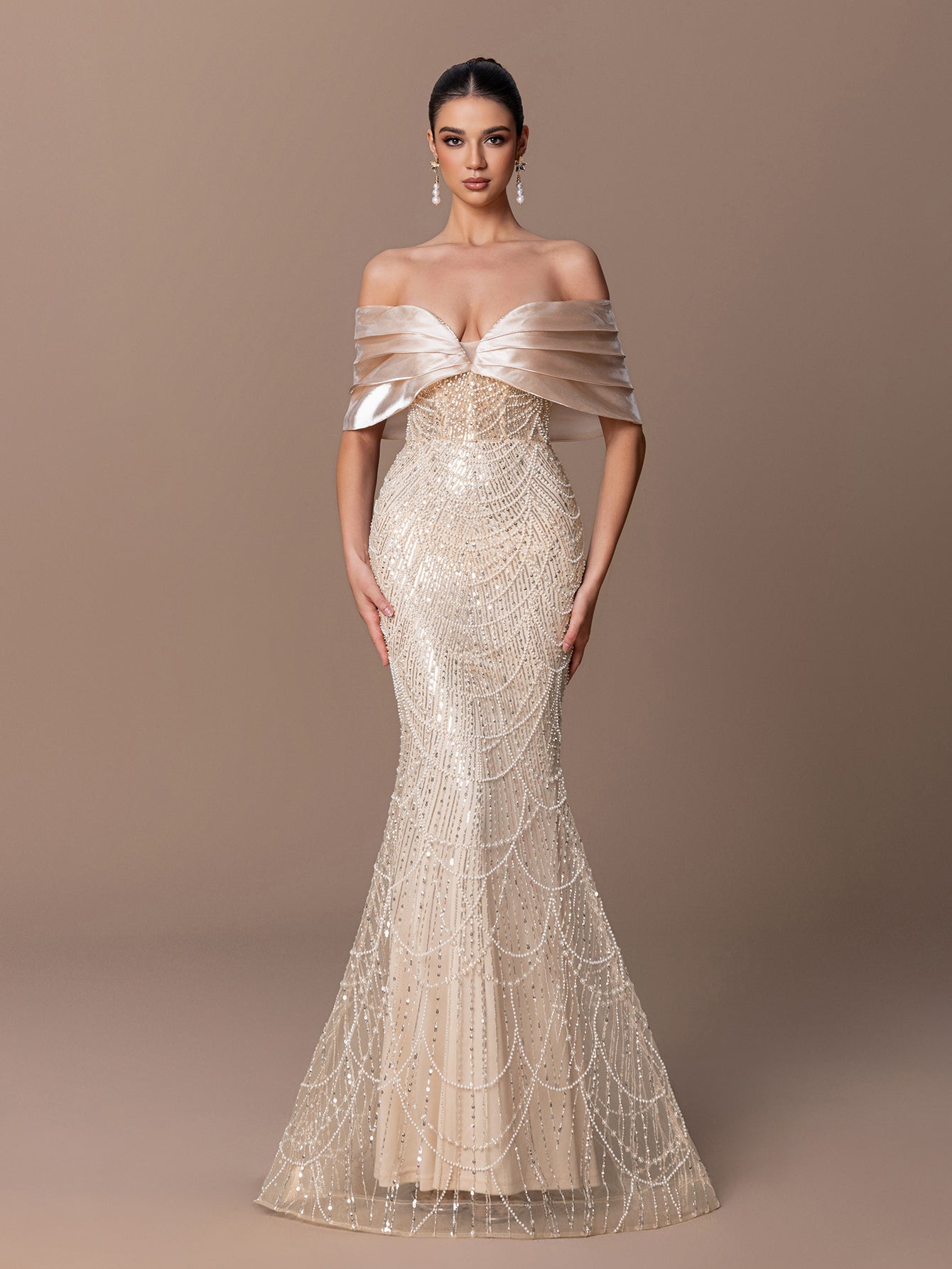 Off-Shoulder Mermaid Gown with Beads/Sequins & Cross-Strap Back Design