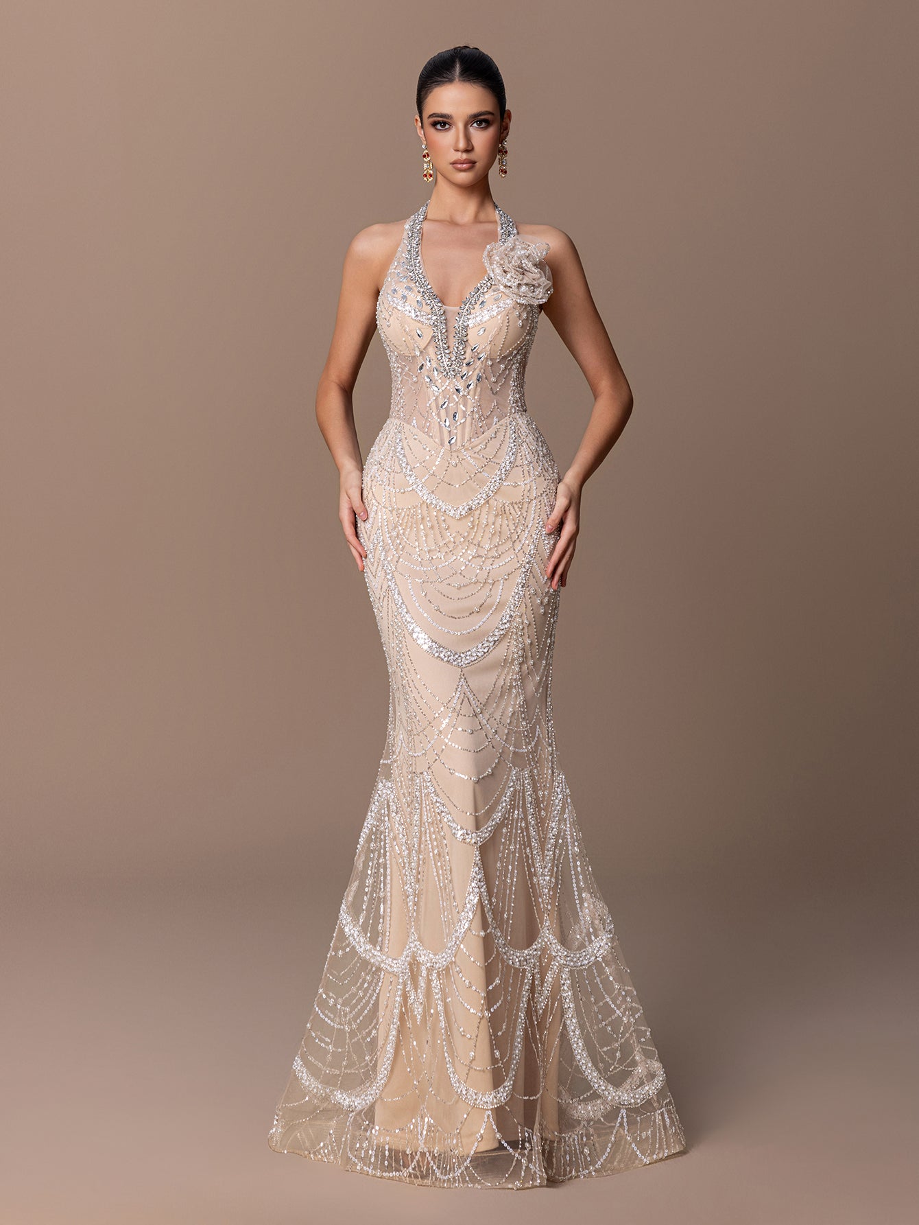 Mermaid Gown with Sequins, Beads, Lace-Up Back & 3D Floral Accents