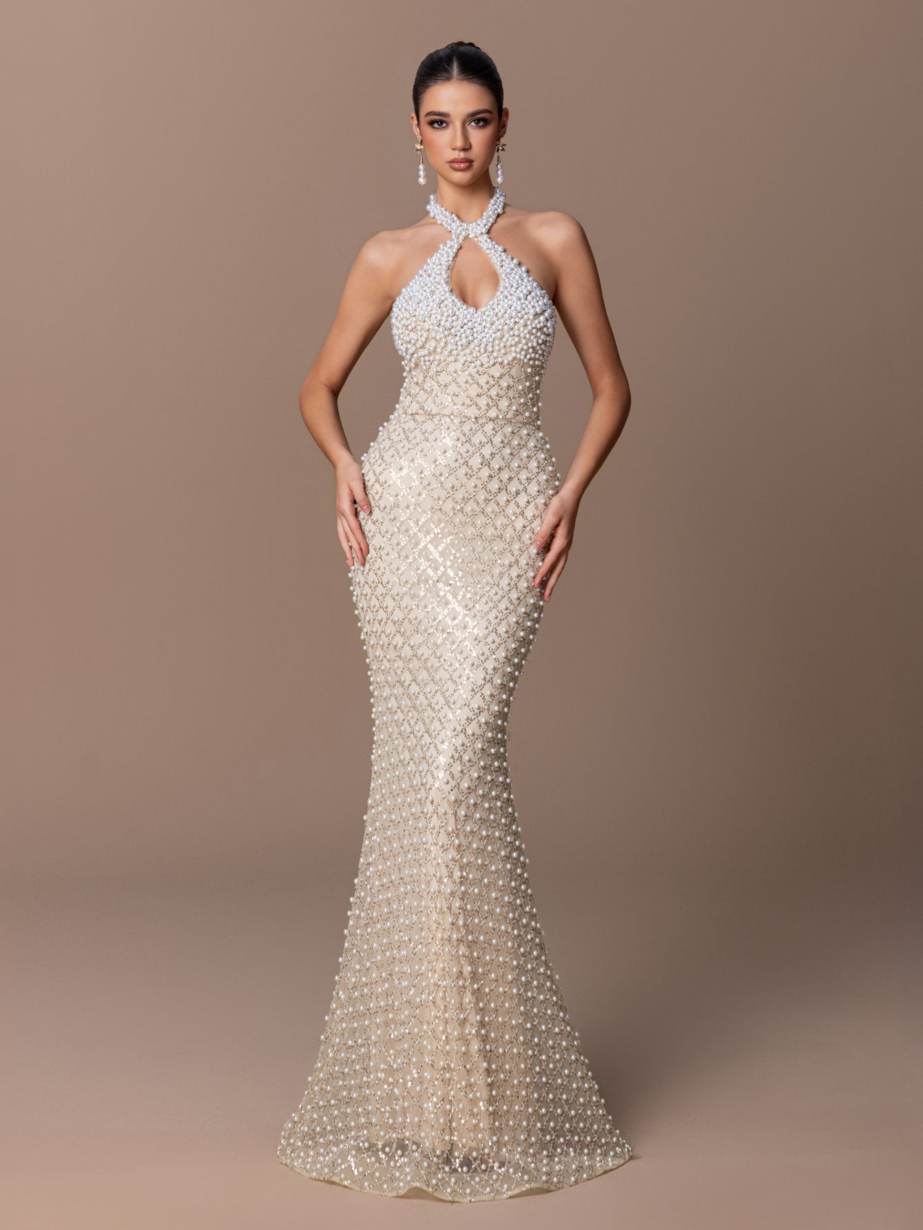 Halter Mermaid Gown with Pearls & Sequins, Cross-Strapped Back & Geometric Patterns