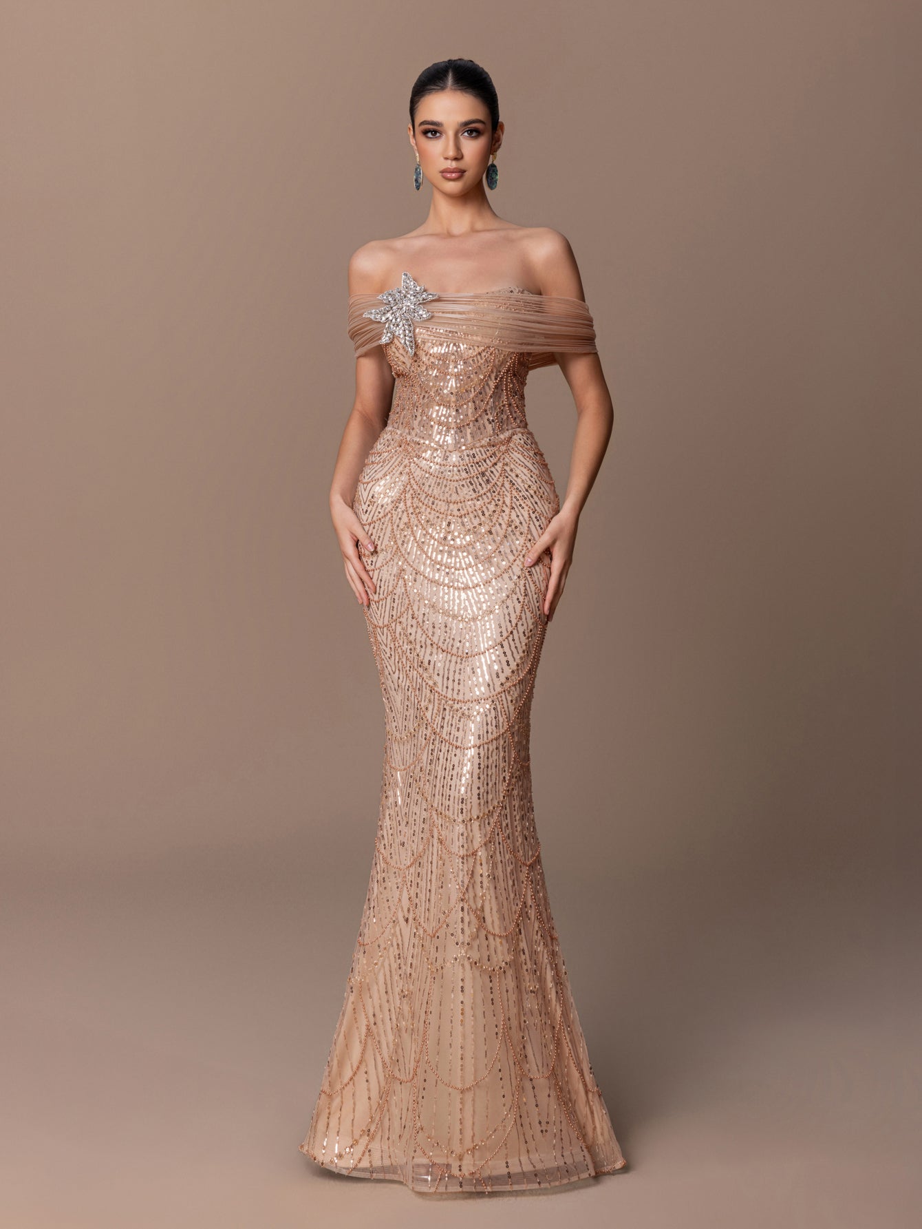 Off-Shoulder Mermaid Gown with Sequin & Bead Fan-Scallop Pattern, Tulle Overlay