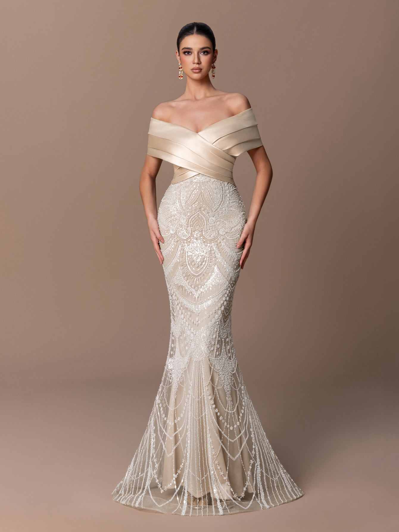 Off-Shoulder Mermaid Gown with Beaded Sequins & Cross-Satin Trim