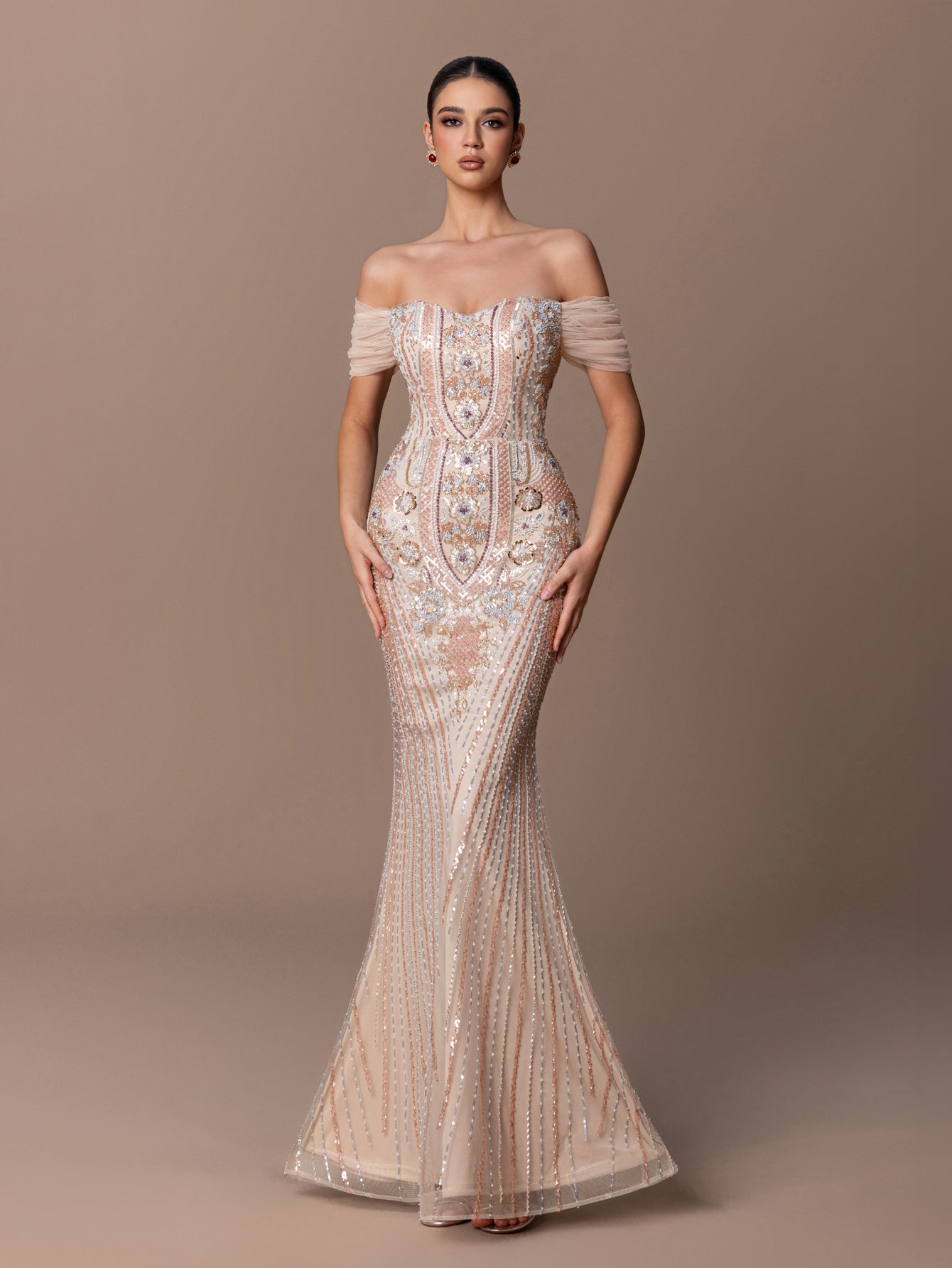 Off-Shoulder Mermaid Gown with Sequins, Beads and Cross-Strappy Back Details