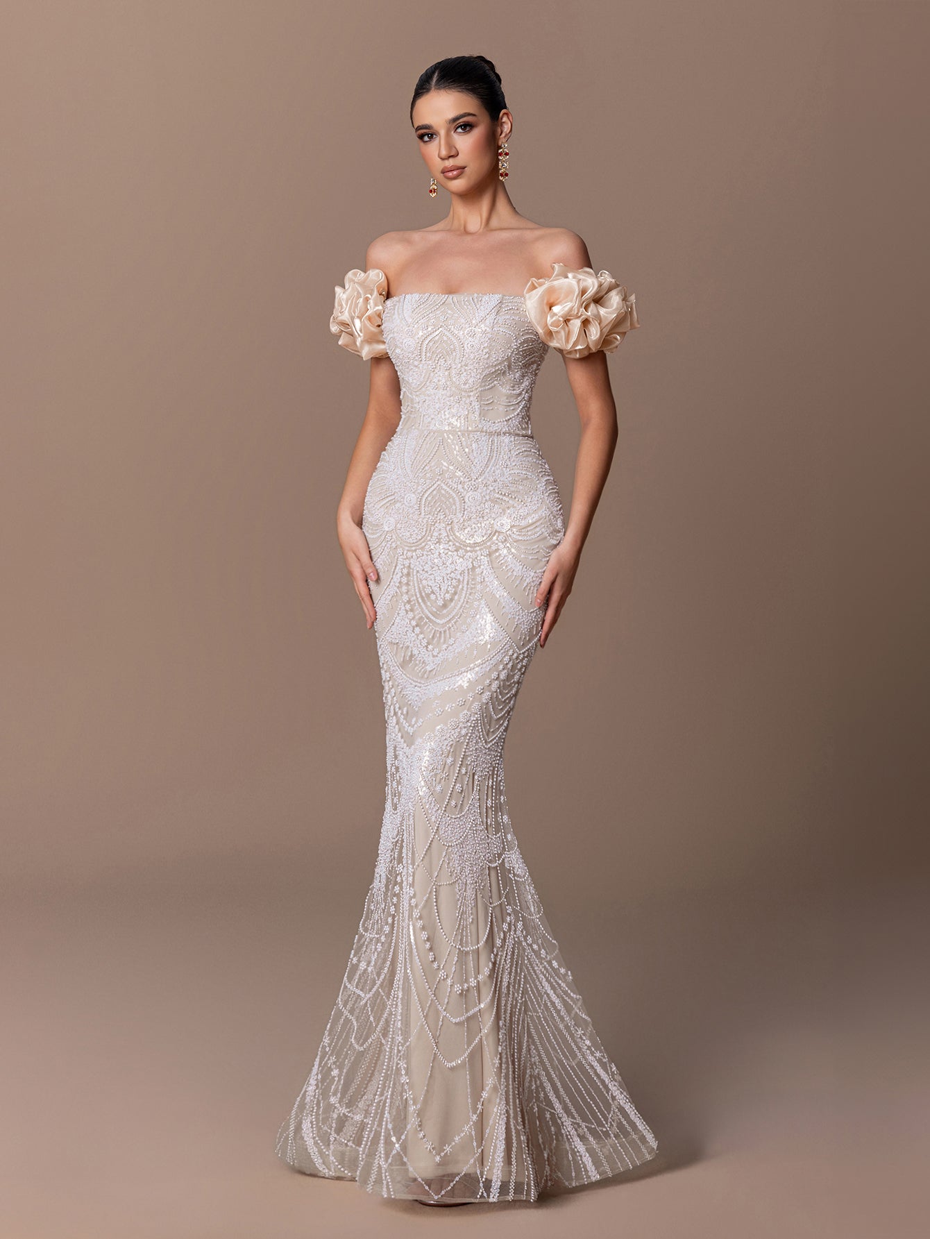 Off-Shoulder Mermaid Gown with Ruffle Flowers, Sequin Embroidery & Beaded Details