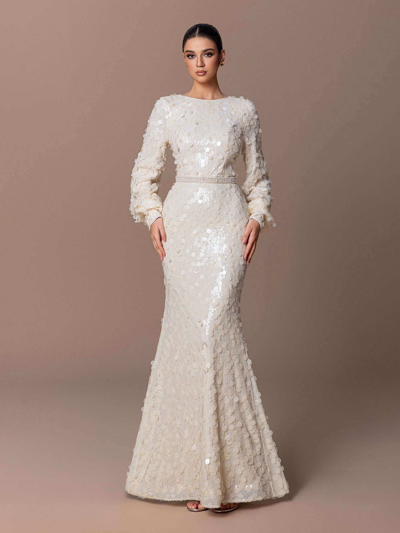 Sequin Mermaid Gown with Puff Sleeve & Pearls Waist Belt