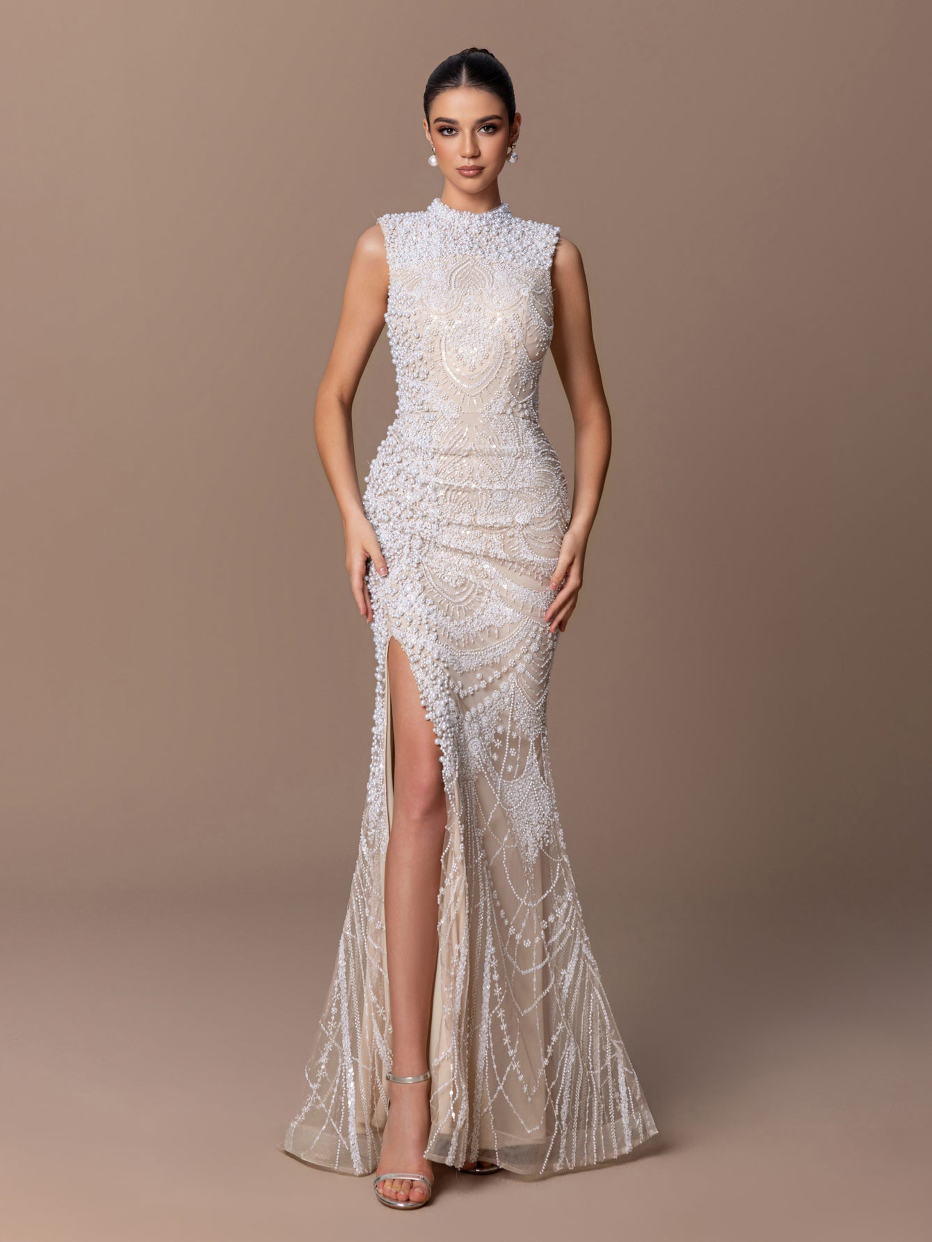 Sleeveless High-Neck Mermaid Gown with Sequins & Pearls, Side Slit