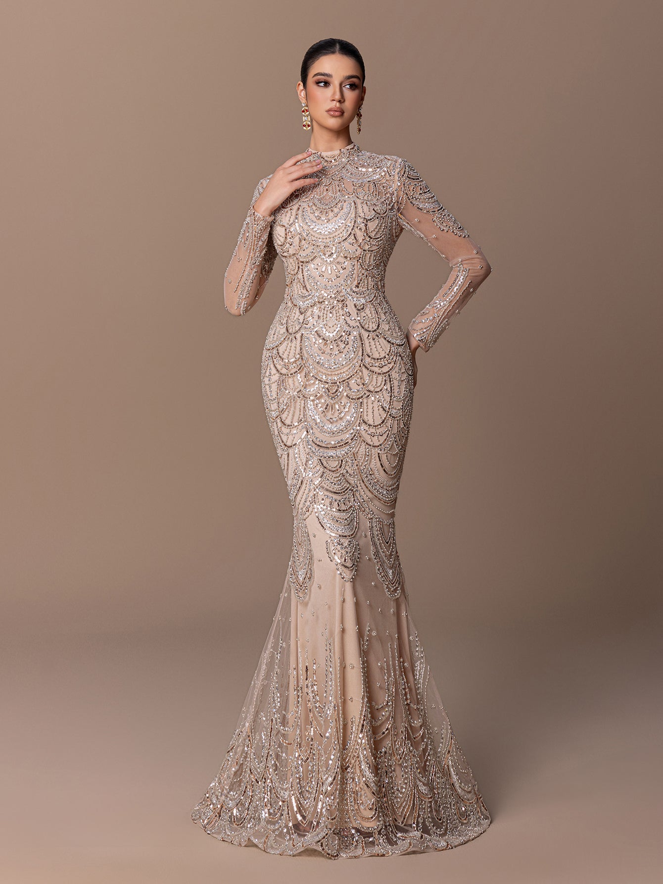Mermaid Gown with High Neck, Long Sleeve, Sequins & Fan-Shaped Bead Embellishments