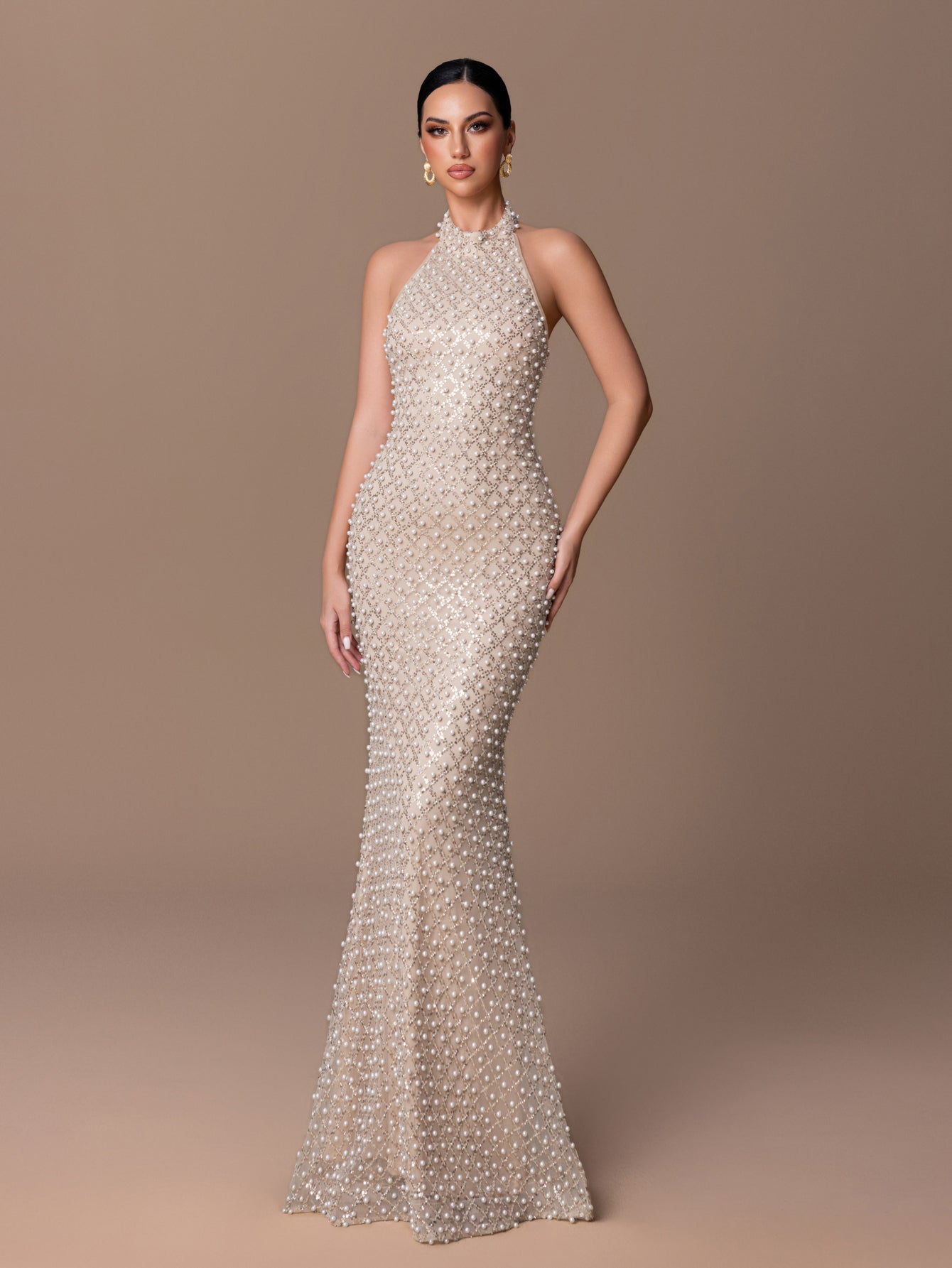 Halter Mermaid Gown with Pearl Beads & Grid Pattern Embellishment