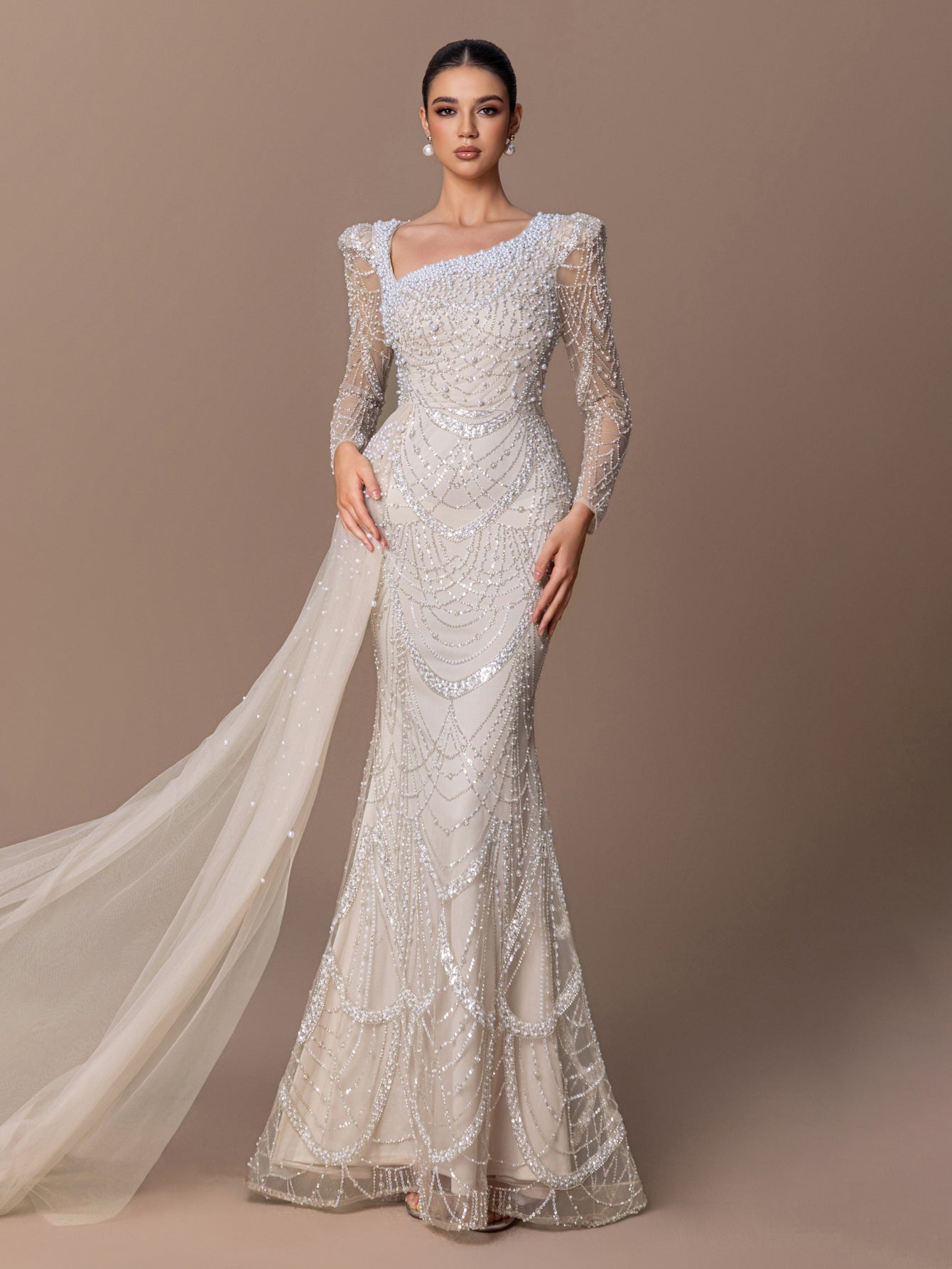 Mermaid Gown with Beaded Sequin Geometrics, Tulle Shawl & Fish-Tail Silhouette